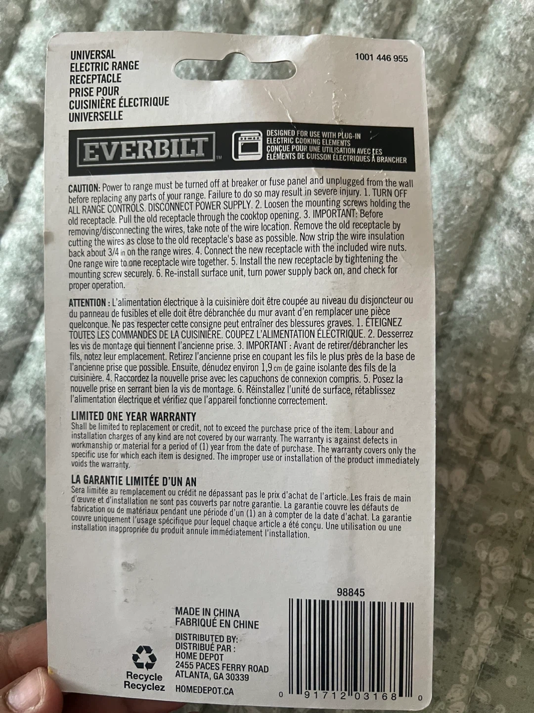 This is a universal electric range receptacle designed for use with plug-in electric cooking elements. It's made in China and distributed by Home Depot.