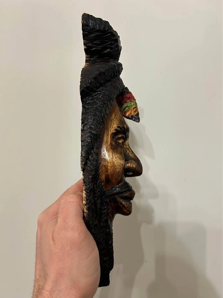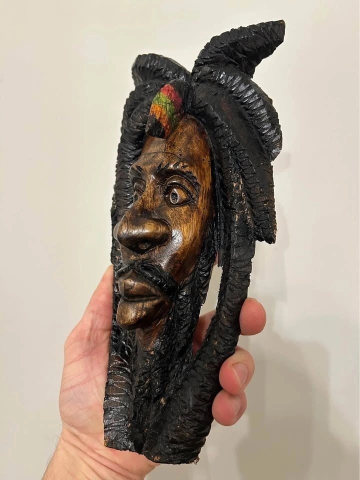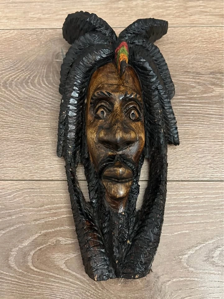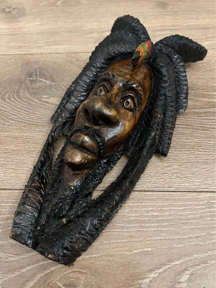 Striking hand-carved folk art wooden mask featuring a detailed portrait inspired by Rastafarian and reggae culture. This expressive piece is carved from a single solid block of wood and showcases skilled chisel-work throughout the facial features, hair, and beard. The textured dreadlocks and beard are finished in a darker tone, creating a strong contrast with the smoother, warm-toned face. At the crown, subtle red, yellow, and green accents add a distinctive Rasta-inspired touch without overpowering the natural wood grain. The carving has a rich, multi-toned surface that highlights the artisan craftsmanship and gives the piece an authentic, rustic character. A metal hook is pre-installed on the back, making it ready for wall display. An eye-catching accent for collectors of folk art, reggae or music-themed décor, or eclectic interiors. Pick up in the Seton area, Calgary. Cash or e-transfer accepted. Let me know if you're interested!