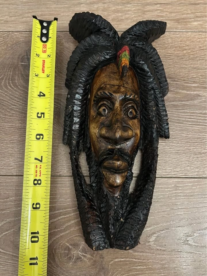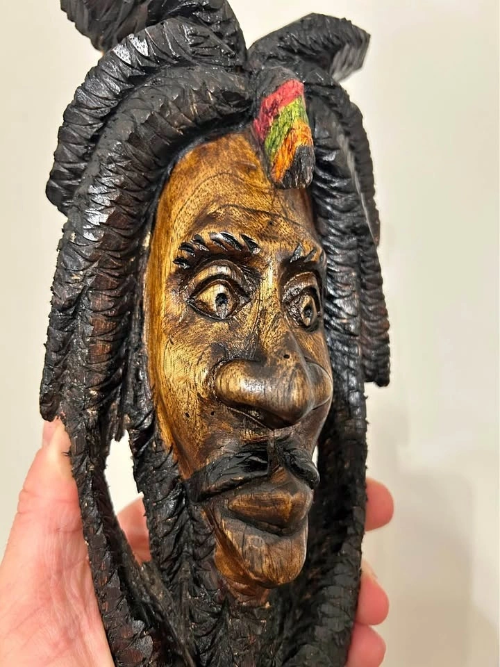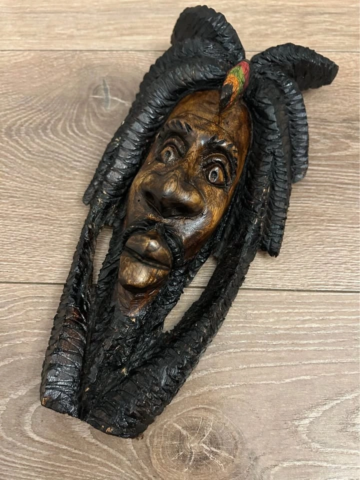 Striking hand-carved folk art wooden mask featuring a detailed portrait inspired by Rastafarian and reggae culture. This expressive piece is carved from a single solid block of wood and showcases skilled chisel-work throughout the facial features, hair, and beard. The textured dreadlocks and beard are finished in a darker tone, creating a strong contrast with the smoother, warm-toned face. At the crown, subtle red, yellow, and green accents add a distinctive Rasta-inspired touch without overpowering the natural wood grain. The carving has a rich, multi-toned surface that highlights the artisan craftsmanship and gives the piece an authentic, rustic character. A metal hook is pre-installed on the back, making it ready for wall display. An eye-catching accent for collectors of folk art, reggae or music-themed décor, or eclectic interiors. Pick up in the Seton area, Calgary. Cash or e-transfer accepted. Let me know if you're interested!