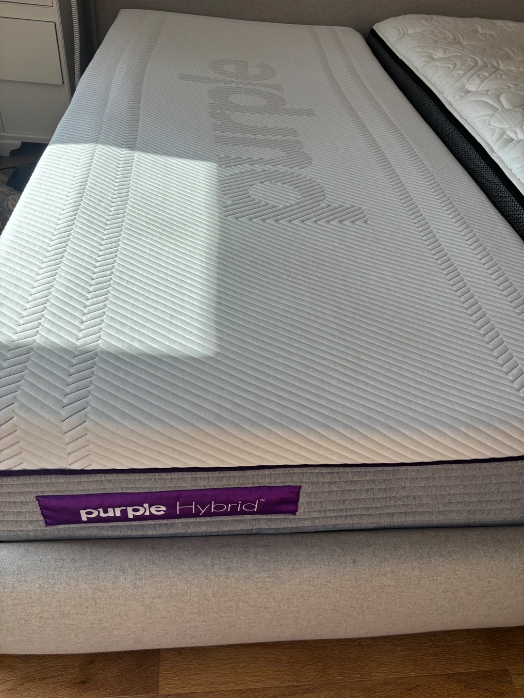 This is a Purple Hybrid mattress. It features a comfort grid for support and breathability. The cover is made of a soft, breathable fabric. This mattress is designed for a comfortable and cool sleep experience.No damage, pet free, smoke free home. Like new, 300