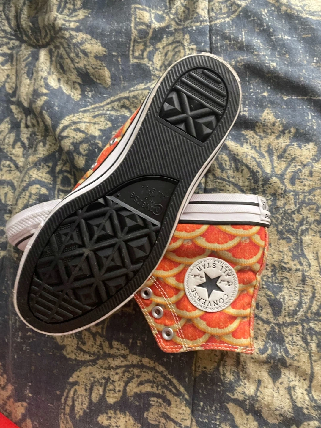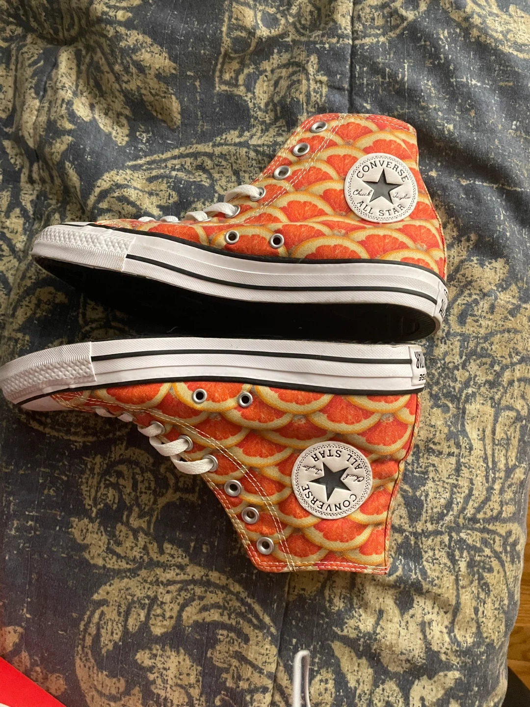 Converse All Star high top sneakers with a citrus slice print. They feature a classic canvas upper and rubber sole.