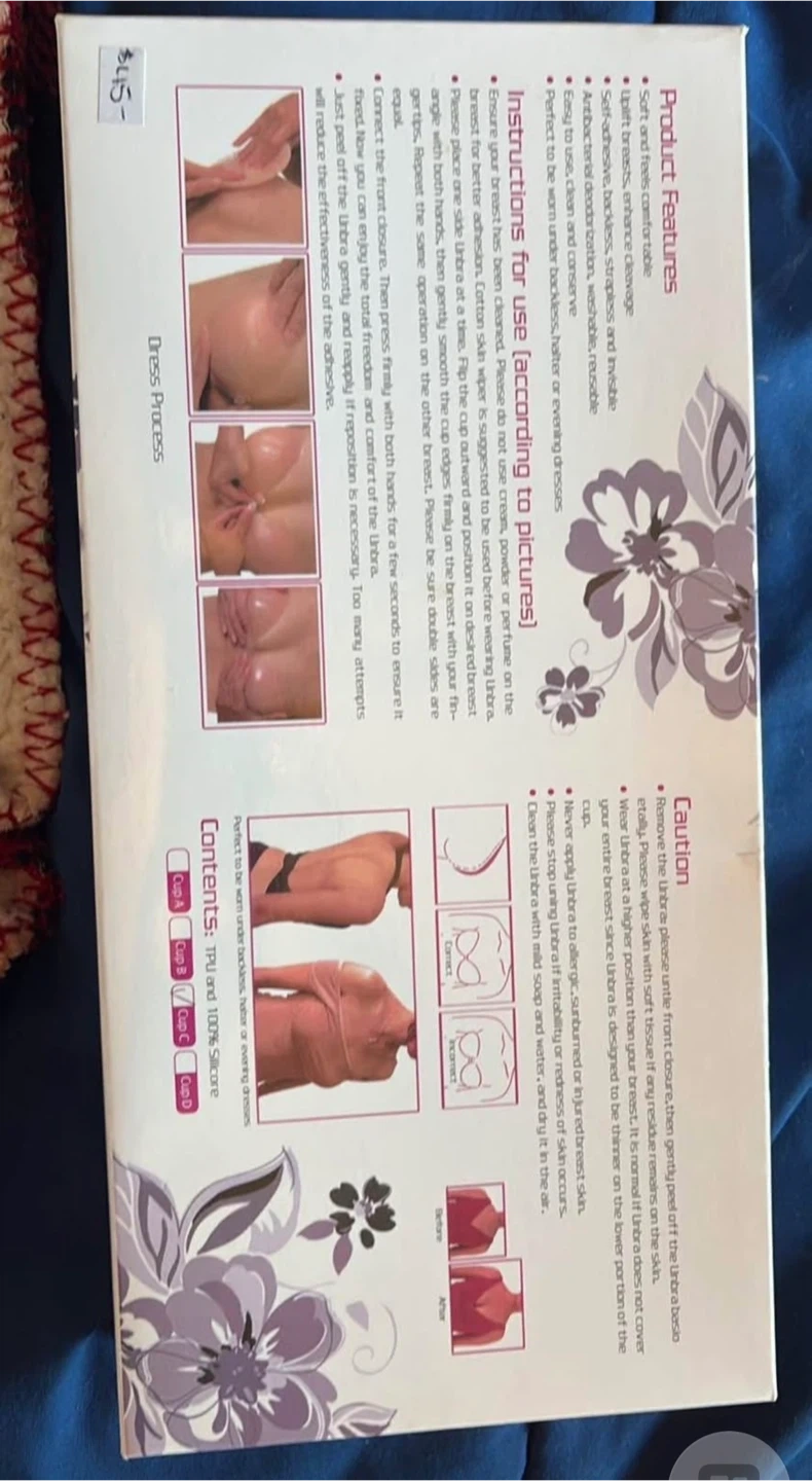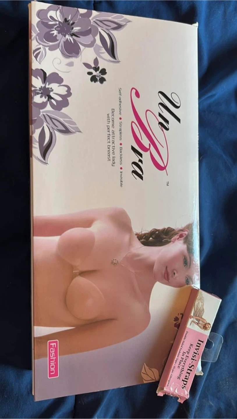 Un Bra silicone adhesive bra for a seamless look. It's self-adhesive and reusable. Contents include: 1 pair of silicone adhesive covers and 1 pair of reusable silicone breast petals.