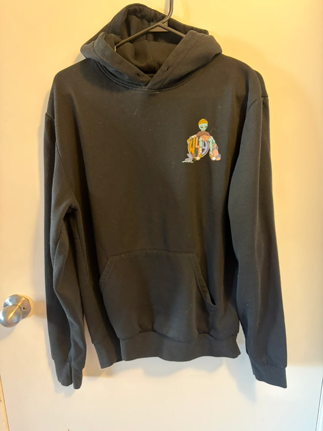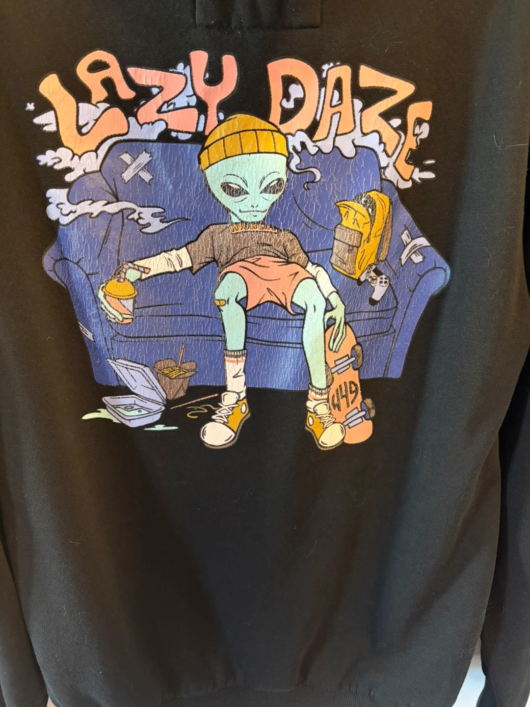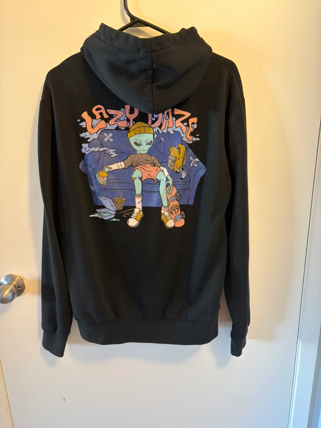 Black hoodie with "Lazy Daze" alien graphic on the back and a small graphic on the front. It's a size S/P. Premium apparel material.