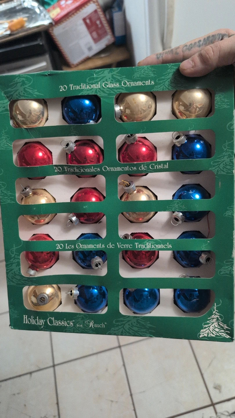 This box contains 20 traditional glass ornaments. They are gold, red, and blue. Ornaments are made of glass.