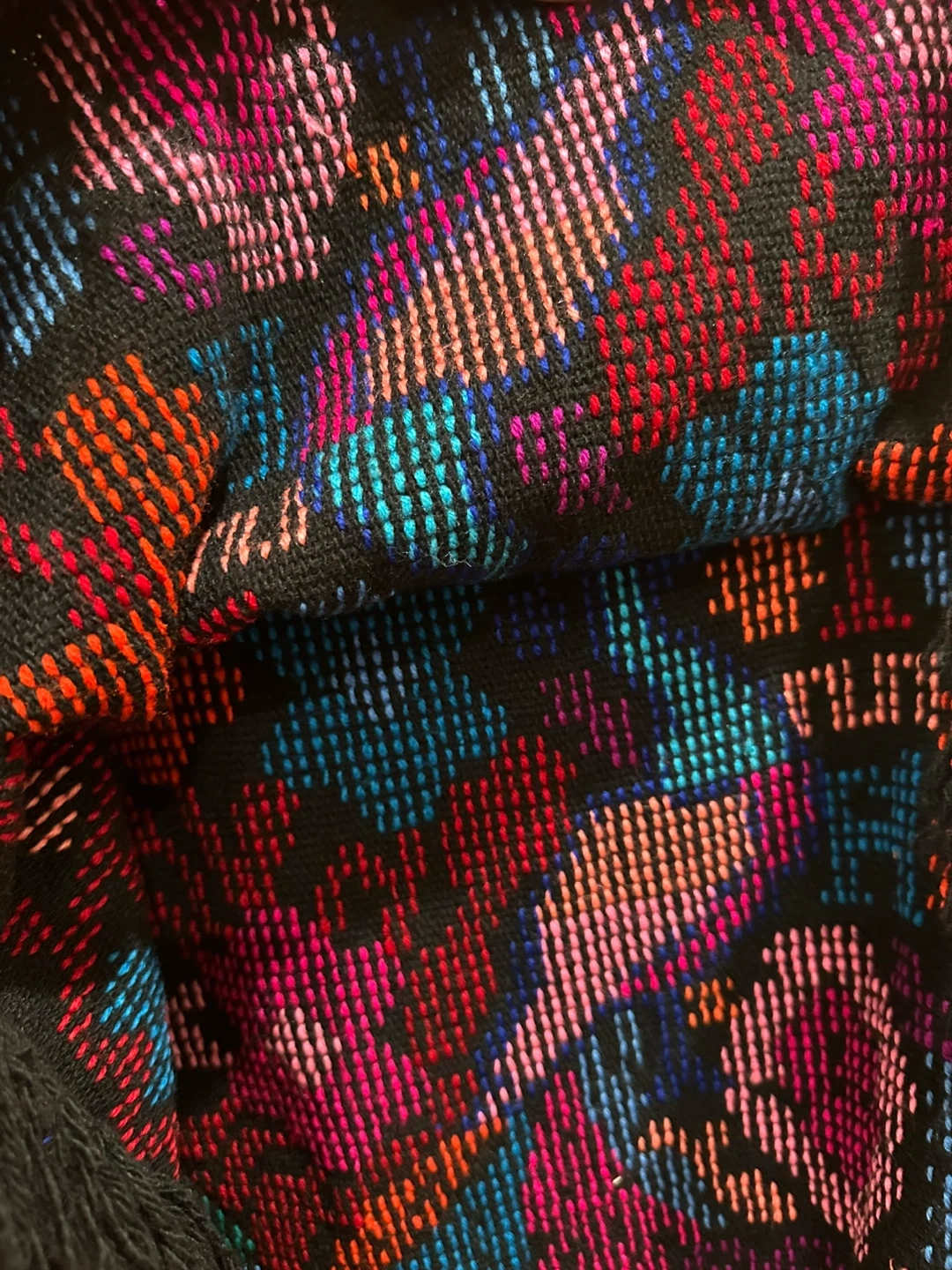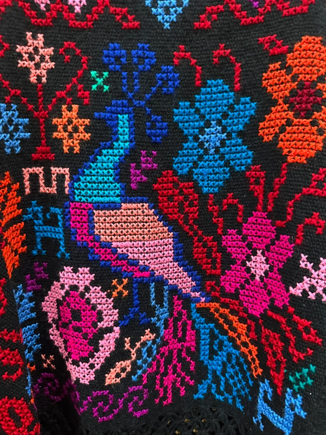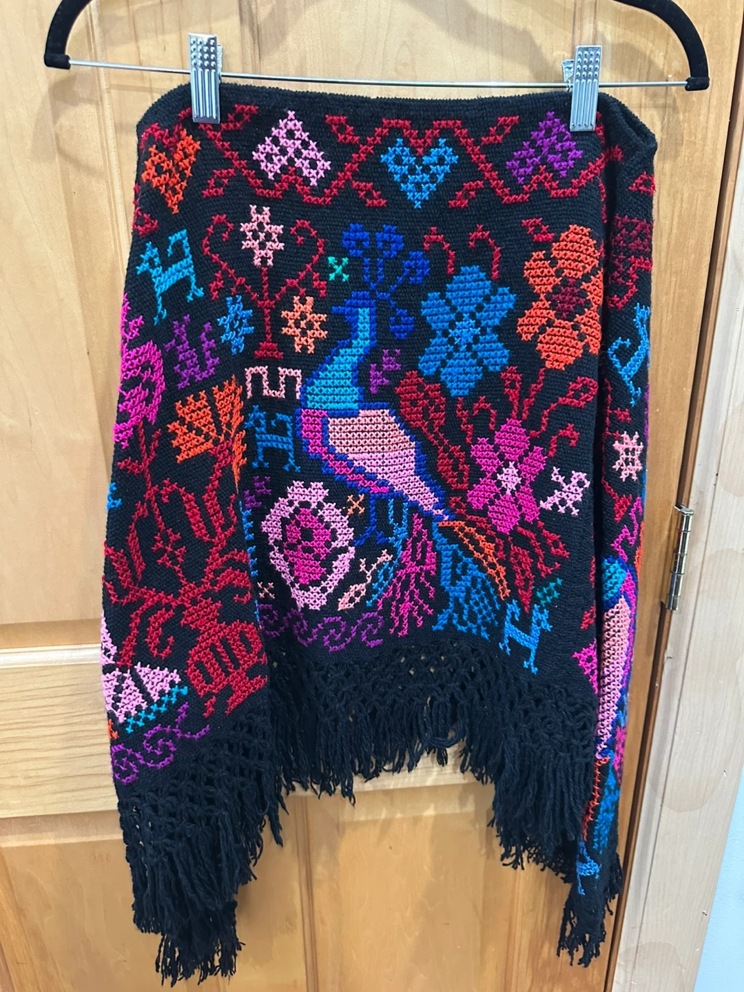 This isn embroidered Mexican poncho featuring a peacock and floral designs in various colors on a black background. It features a fringe at the bottom. It has never been used so this makes the perfect gift! I accept offers.