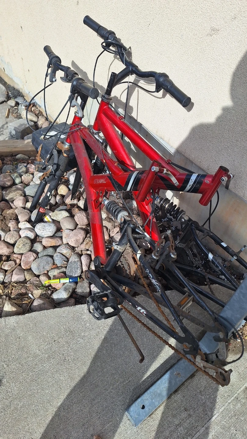 This is a red dual suspension mountain bike frame. It appears to be a full suspension model. The frame is made of metal and has some decorative stripes. It's in used condition and needs tires 24 iinch