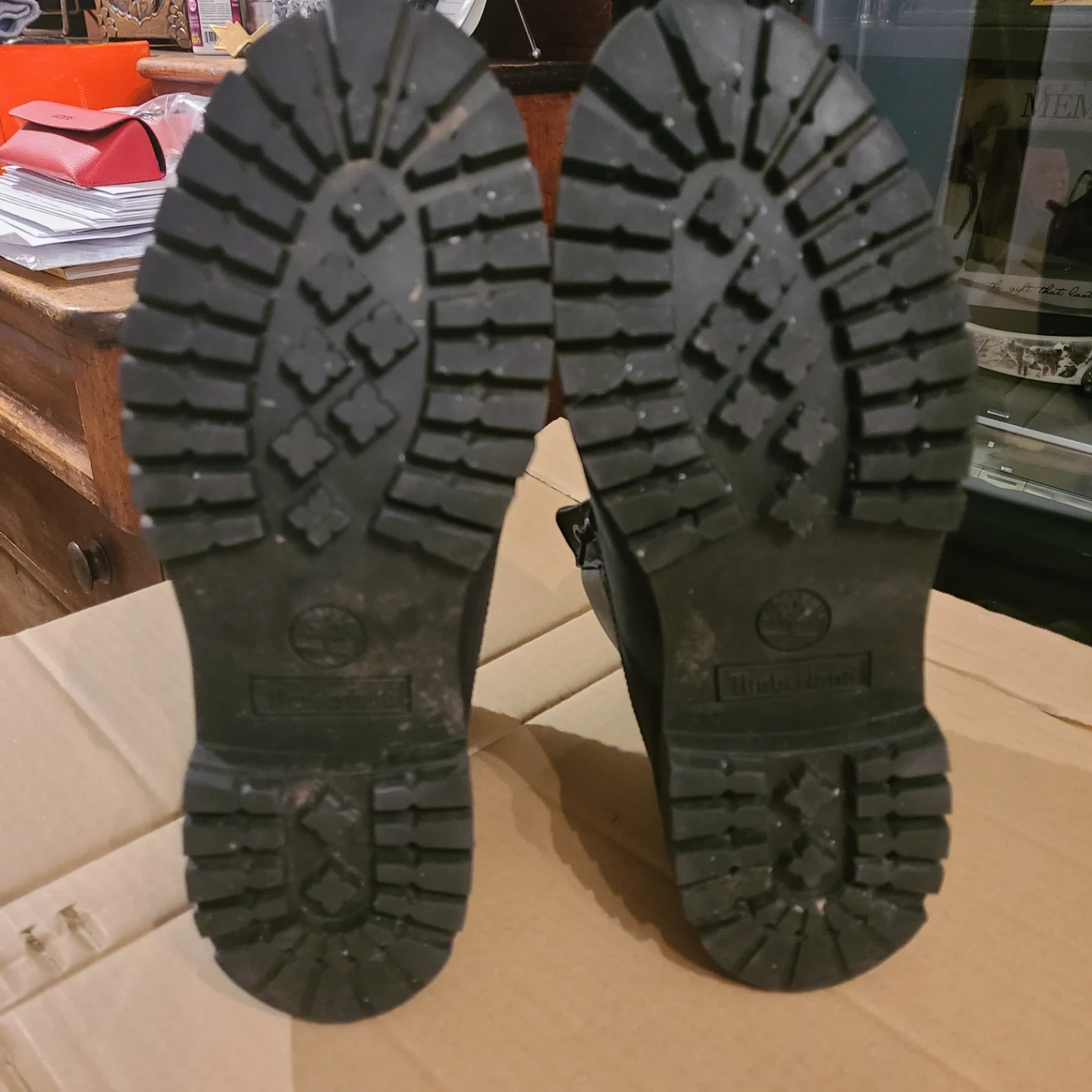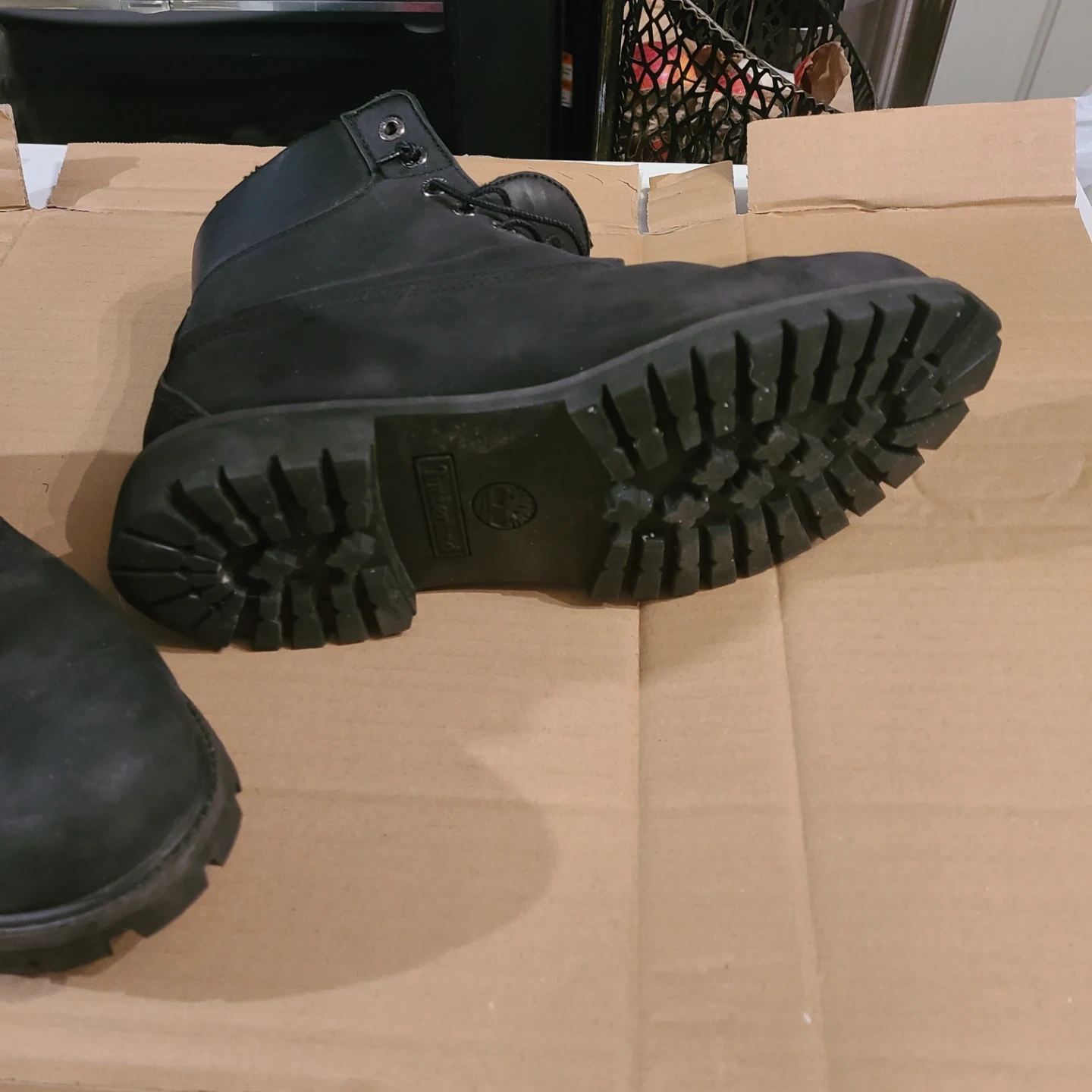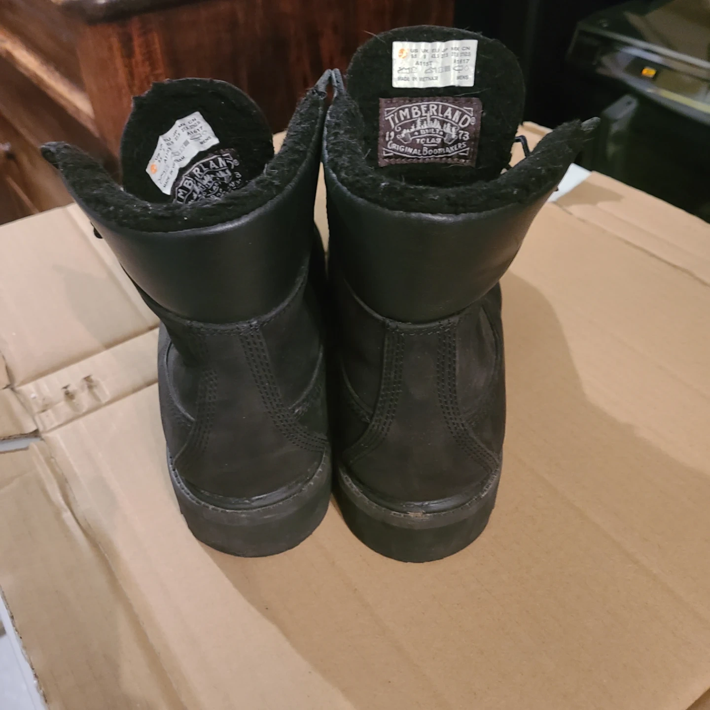 These are black Timberland lace-up boots. Made in Vietnam. They're men's size 9.5 US. Featuring a durable sole and warm lining.