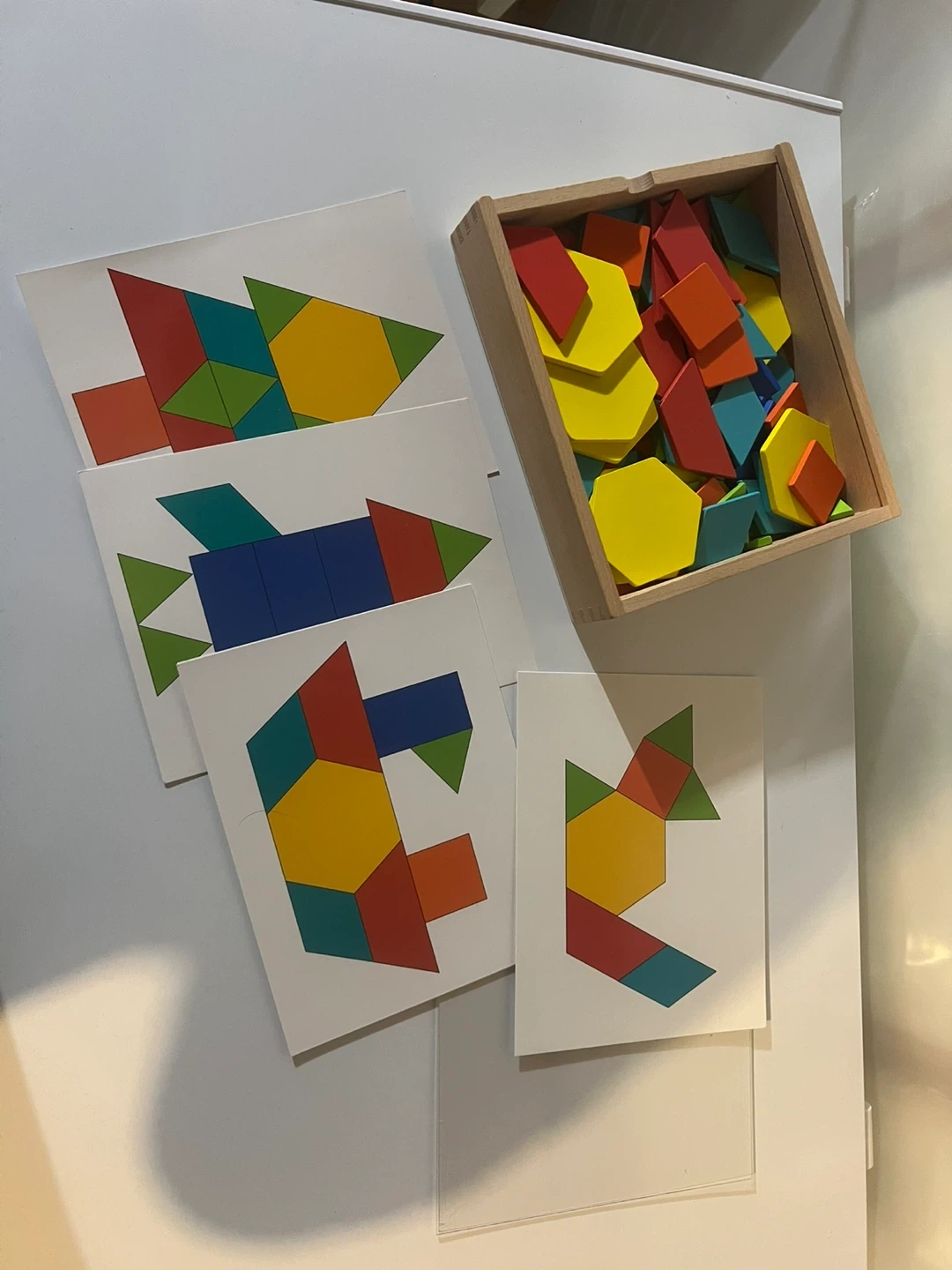 This wooden pattern blocks set includes various colourful geometric shapes. It comes with multiple picture boards to create different designs. Great for developing spatial reasoning skills!