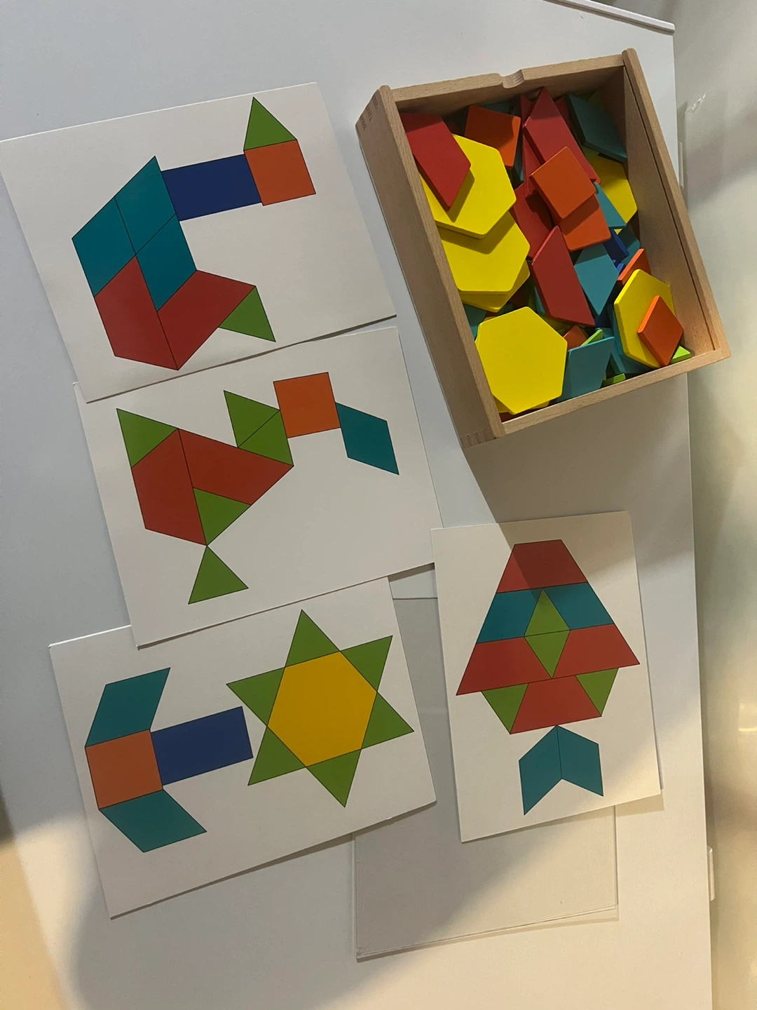 This wooden pattern blocks set includes various colourful geometric shapes. It comes with multiple picture boards to create different designs. Great for developing spatial reasoning skills!