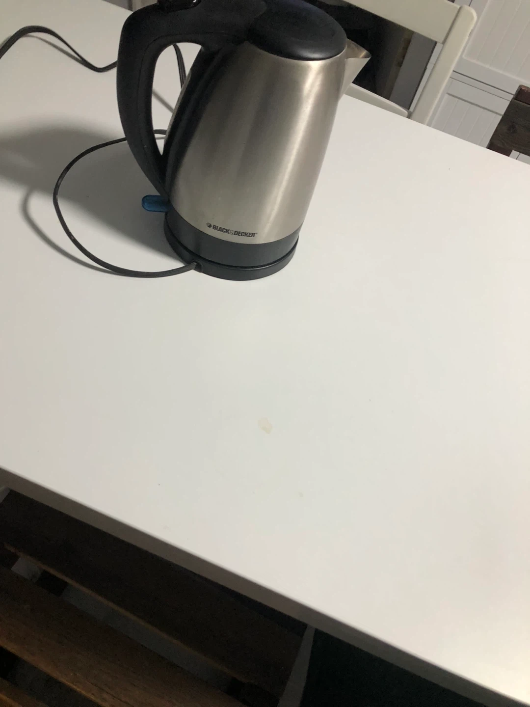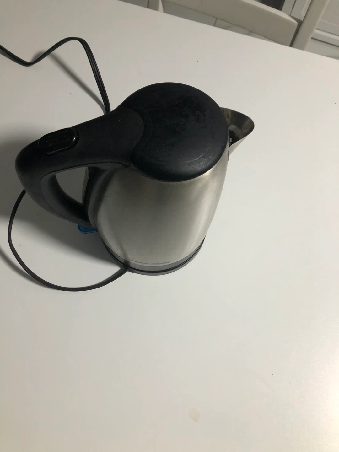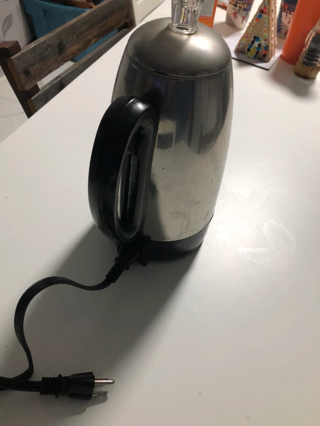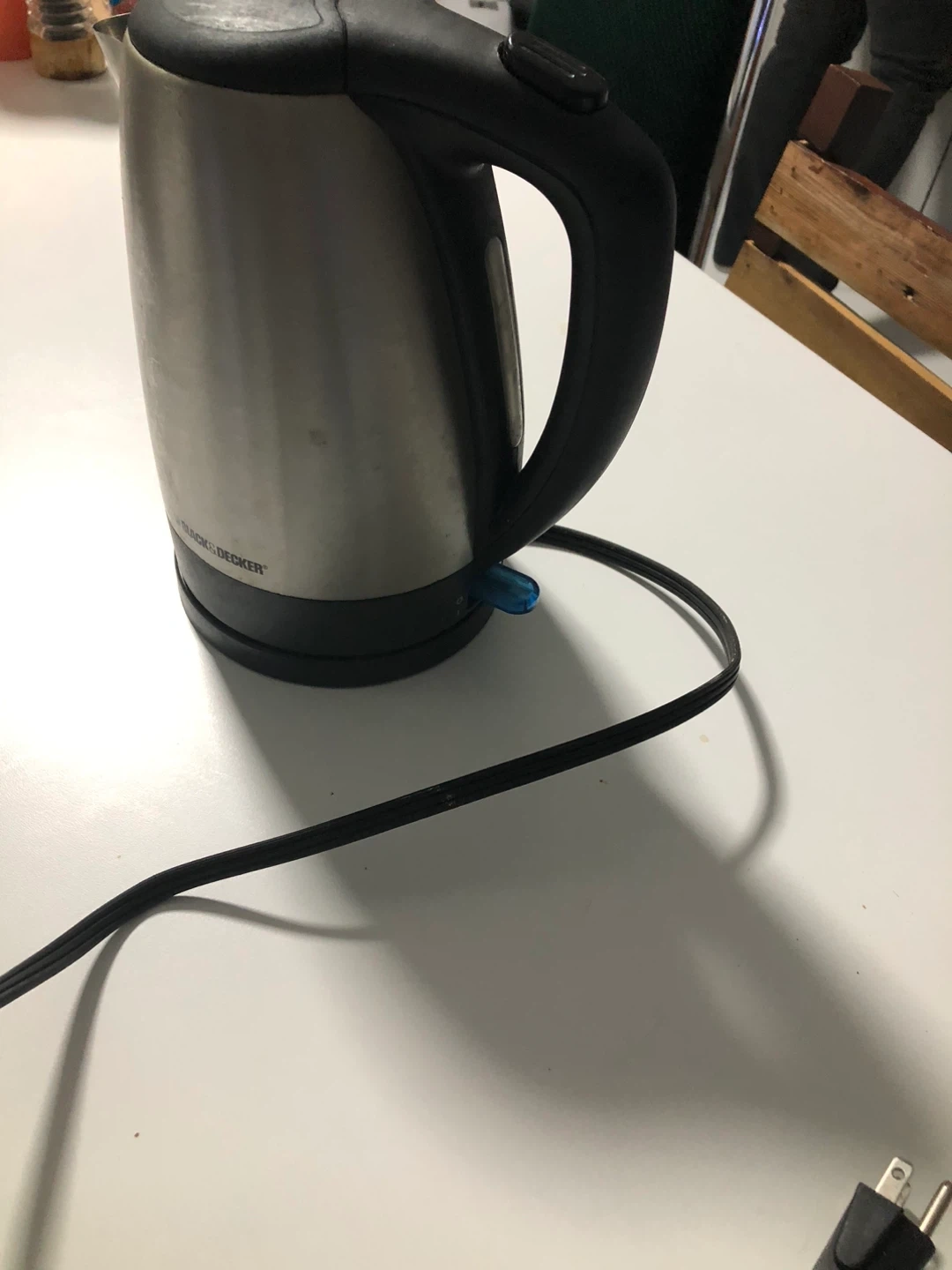 Stainless steel electric kettle by Black & Decker. It features a black handle and lid. Plugs into a standard outlet.