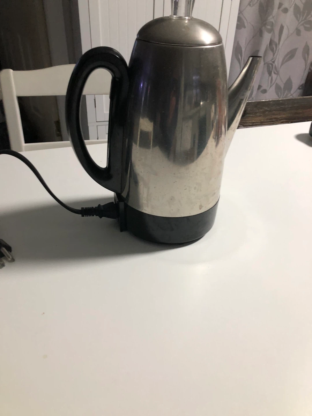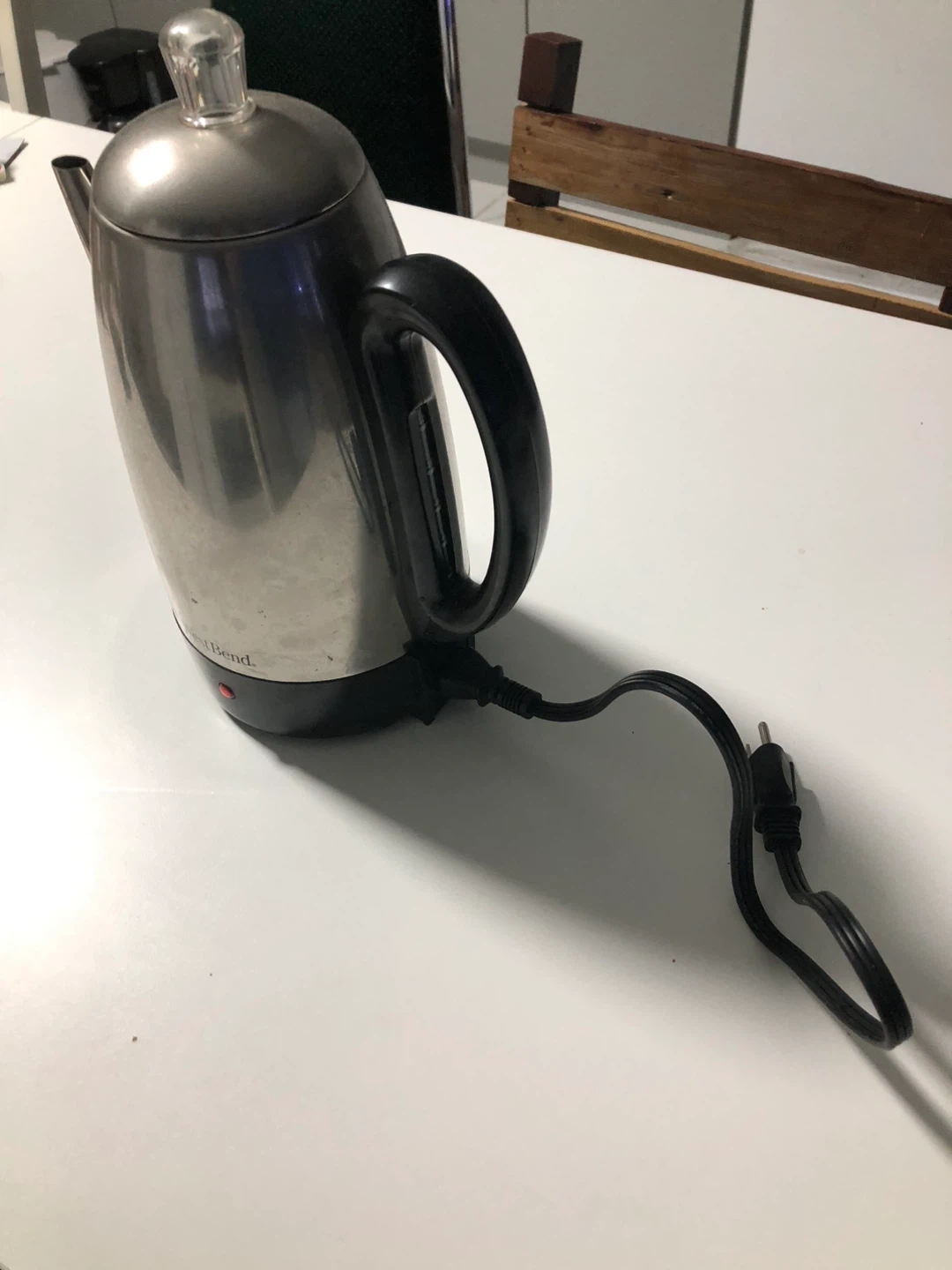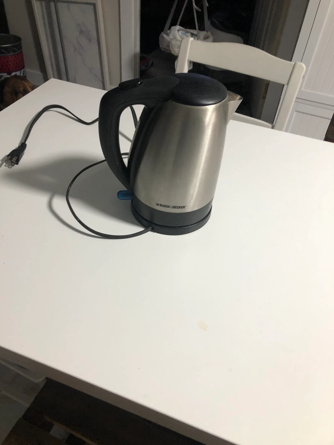 Stainless steel electric kettle by Black & Decker. It features a black handle and lid. Plugs into a standard outlet.