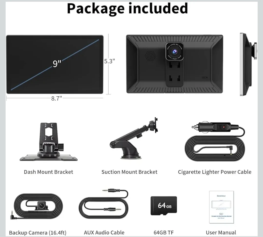 Portable Apple Carplay Screen for Car, 9" Wireless Apple Carplay & Android Auto,4K Dash Cam,1080p Backup Camera DVR,Car Audio Receivers GPS Navigation Mirror Link, Bluetooth,FM, Siri