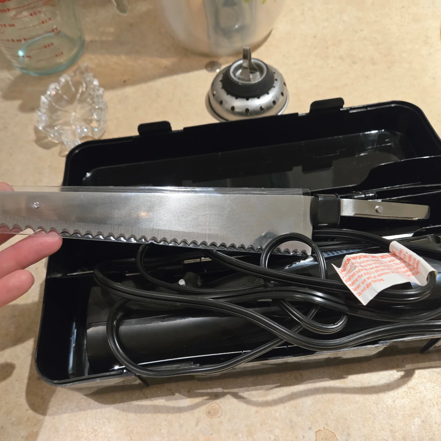 Selling a Thinkkitchen electric knife set! It comes in a convenient black carrying case. The set includes the electric knife and the power cord. Perfect for carving turkeys or roasts!