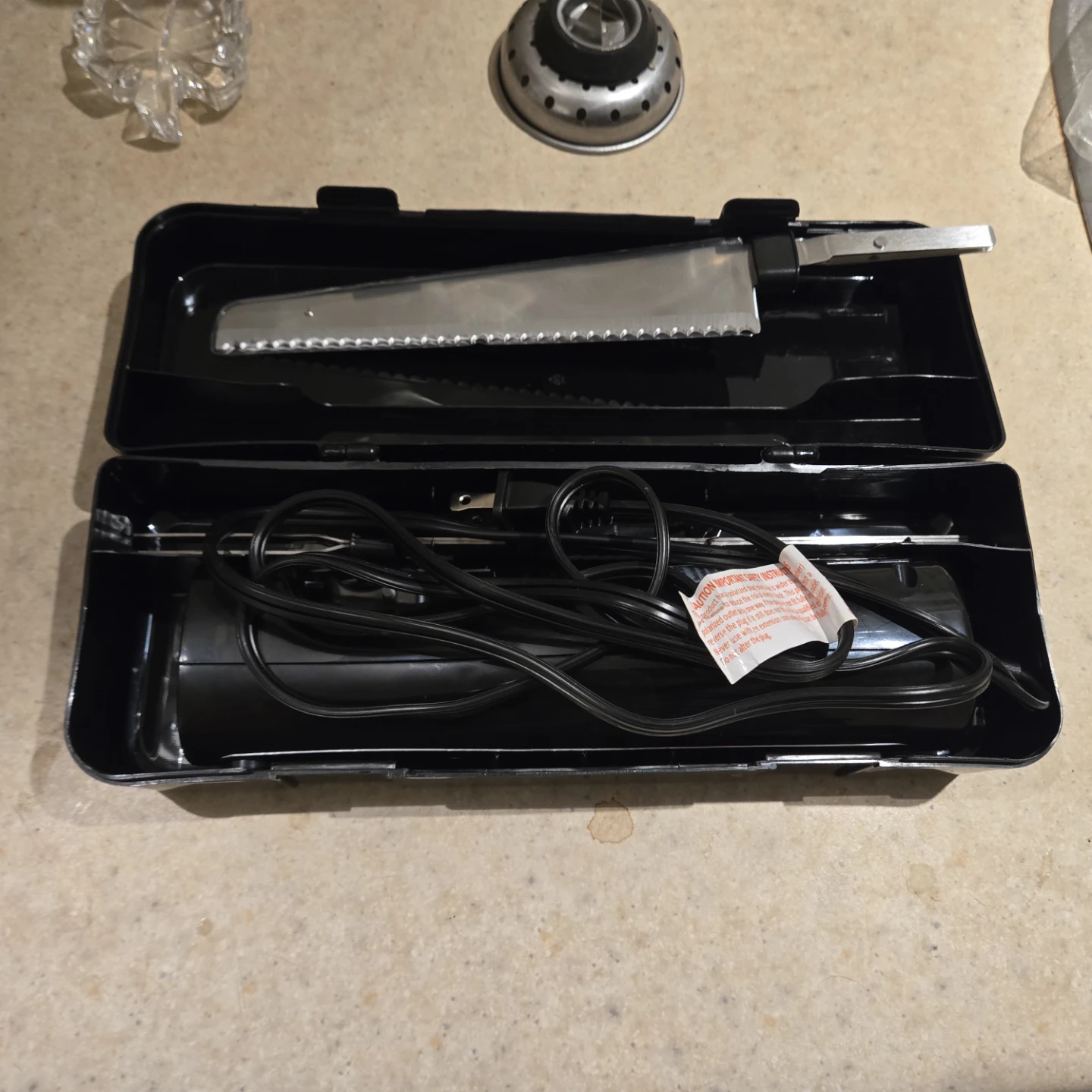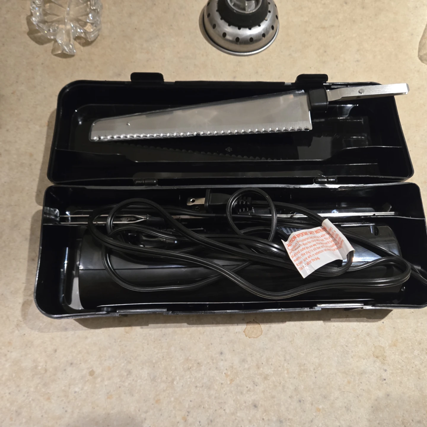 Selling a Thinkkitchen electric knife set! It comes in a convenient black carrying case. The set includes the electric knife and the power cord. Perfect for carving turkeys or roasts!