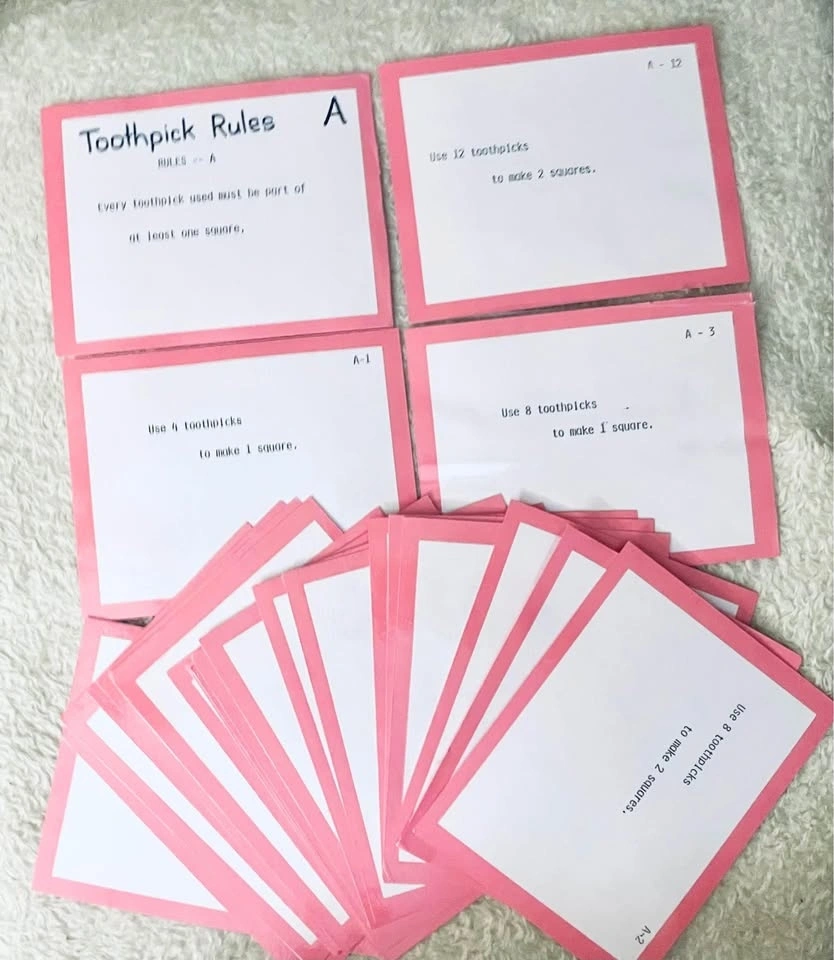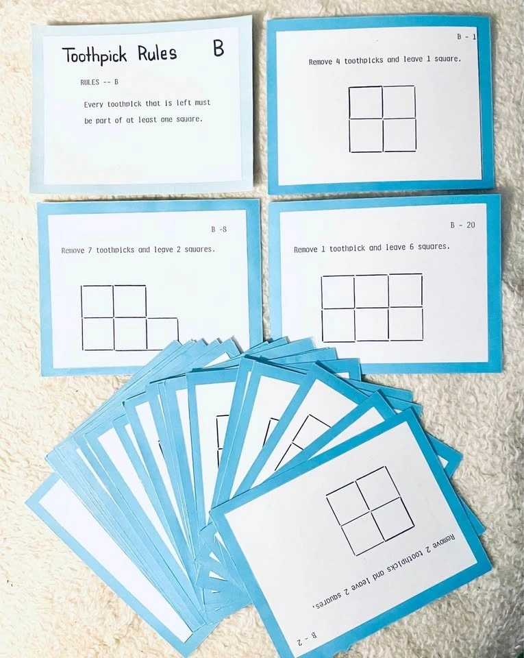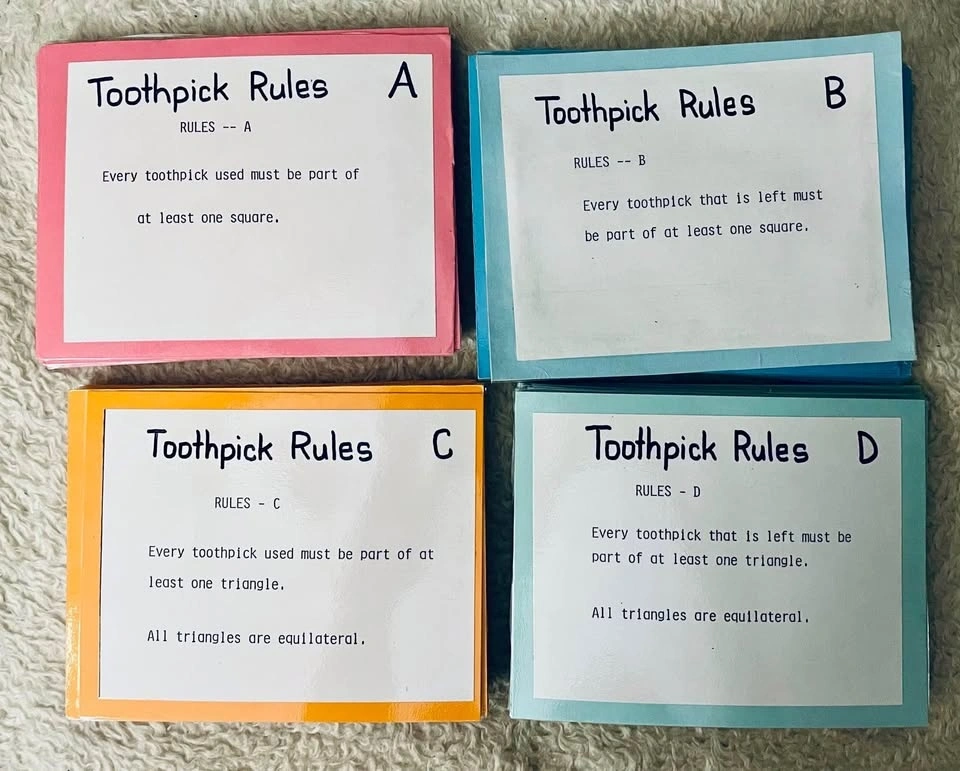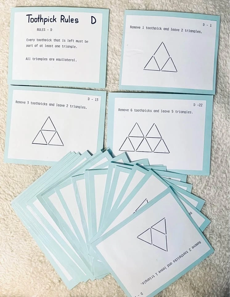 Educational game for kids to learn geometrical properties of squares and triangles using toothpicks or popsicle sticks. Includes 4 sets (88 cards total): 4 colour-coded rule cards and 22 puzzles per set. Cards are laminated and come with a ziplock storage pouch. Great for math centres, small groups, or whole class activities to reinforce geometry and problem-solving skills in a fun way.