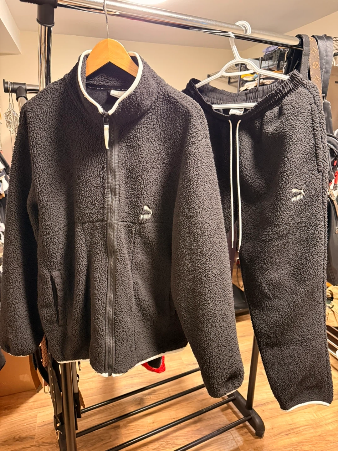 This is a black Puma sherpa fleece set. It includes a full-zip jacket and matching pants. The material is soft and warm, perfect for cooler weather!