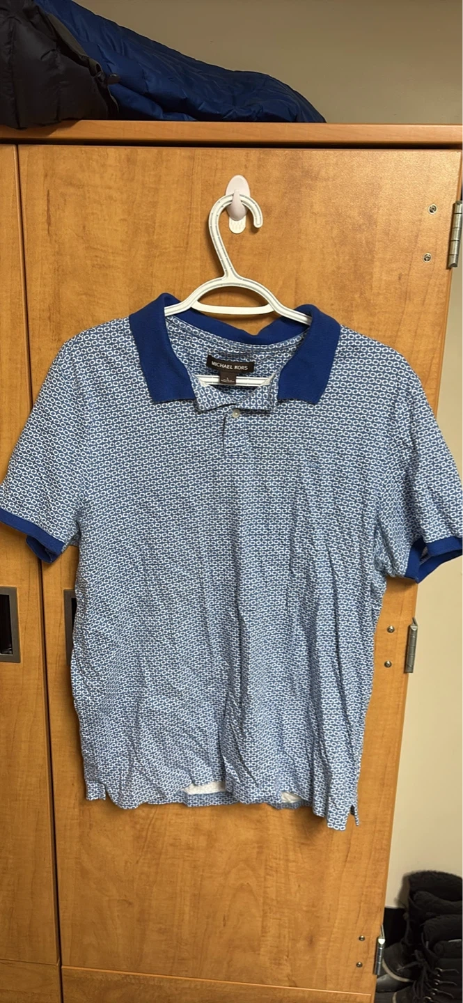 This is a Michael Kors men's short-sleeve polo shirt. It features a blue and white geometric pattern with solid blue trim on the collar and cuffs.