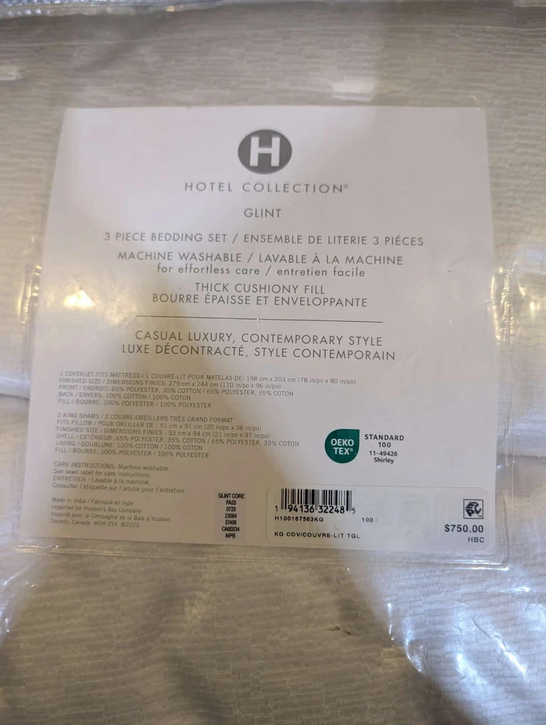 Selling a Hotel Collection Glint 3-piece king bedding set! This set includes a coverlet (279 cm x 244 cm) and two king shams (53 cm x 94 cm). The coverlet fits mattresses 198 cm x 203 cm, and the shams fit pillows 51 cm x 91 cm.