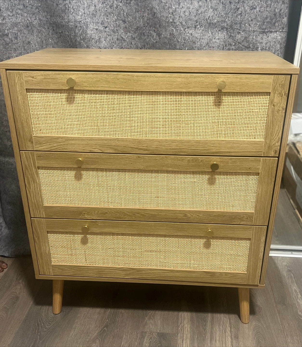Here's a lovely wooden dresser with three drawers! It features a stylish design with rattan fronts and brass knobs. It would be a great addition to any bedroom or living space.