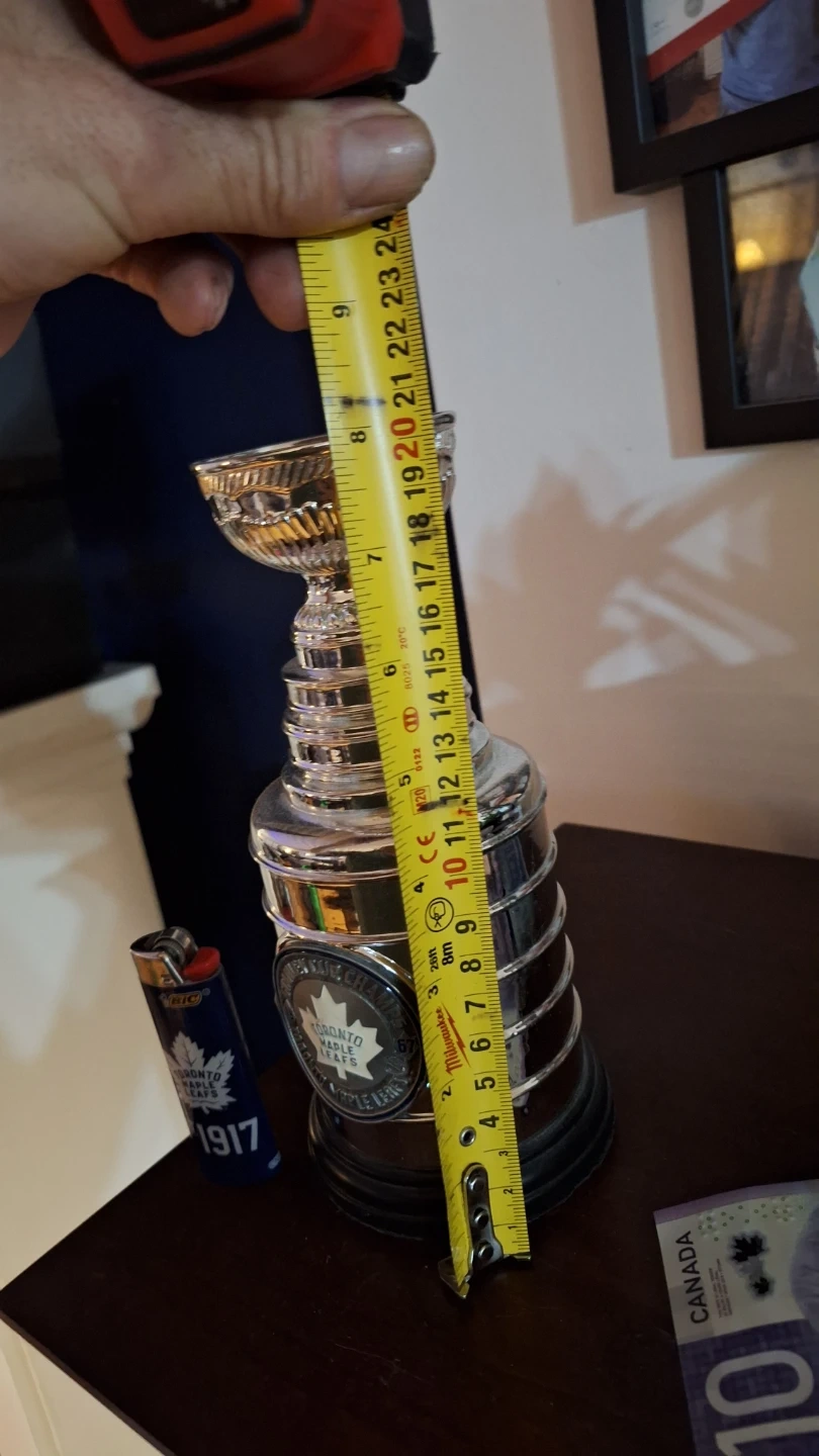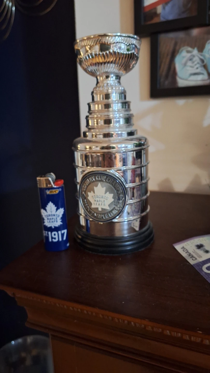 Commemorative replica trophy celebrating the 1967 Toronto Maple Leafs Stanley Cup victory. It's approximately 8 inches tall. Makes a great display piece for any hockey fan!