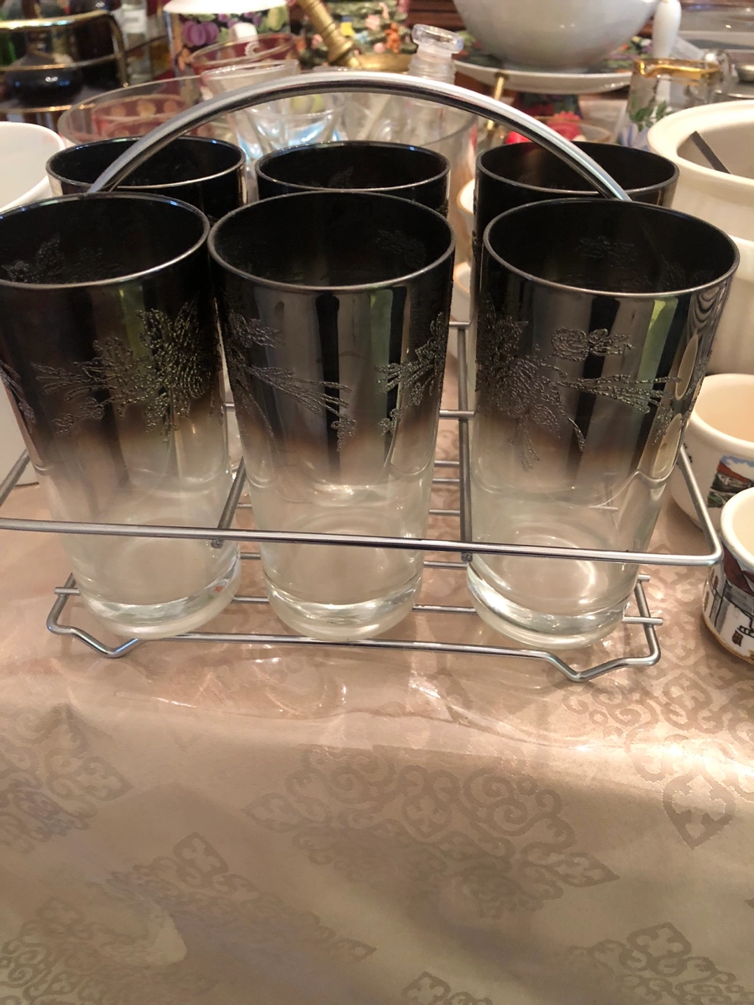 Six metallic ombre drinking glasses. Etched design. Chrome wire rack included. Great for entertaining.