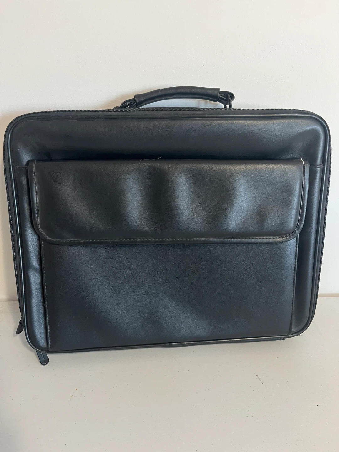 This is a black leather briefcase. It has a zippered main compartment and a front pocket with a snap closure. The material is durable faux leather. It's suitable for carrying documents and a laptop.