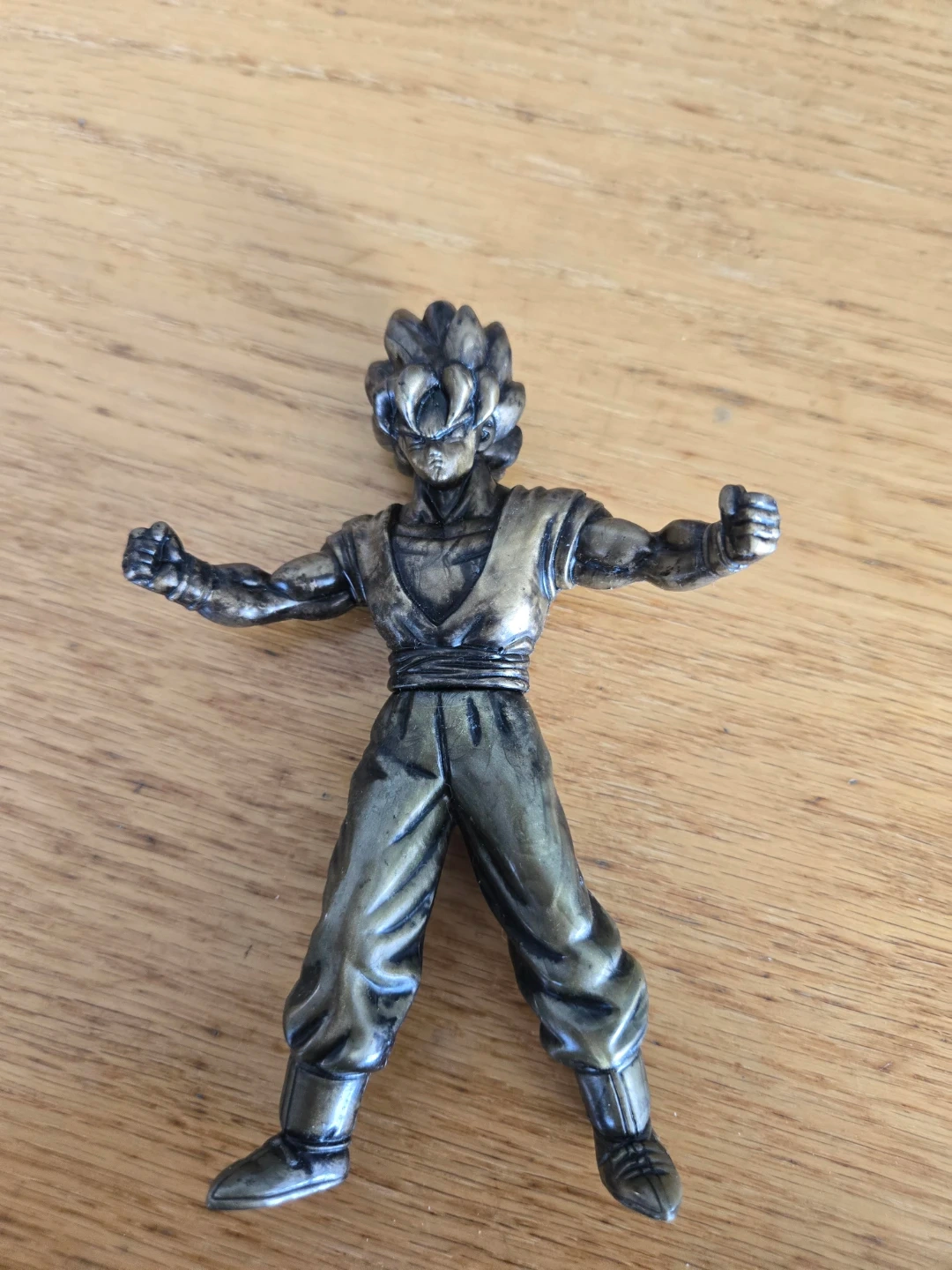 This is a metal look figurine of Goku from Dragon Ball Z. It's a collectible item for fans of the series. The figure's metallic finish gives it a premium feel.