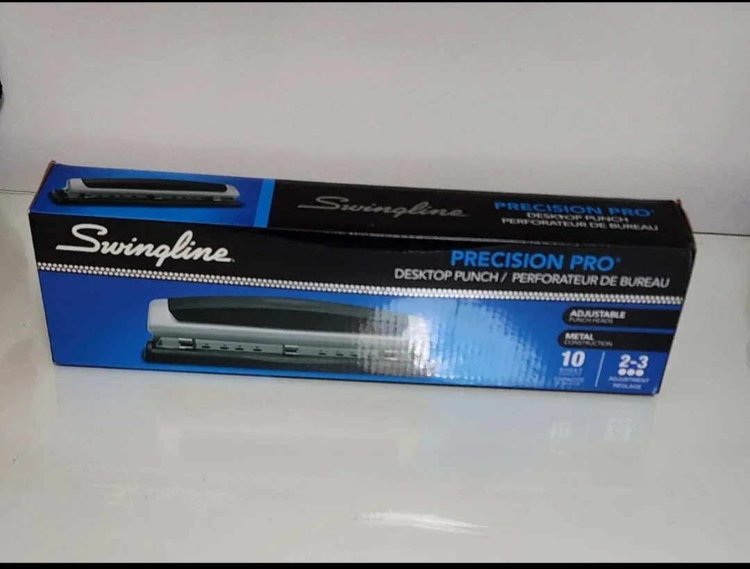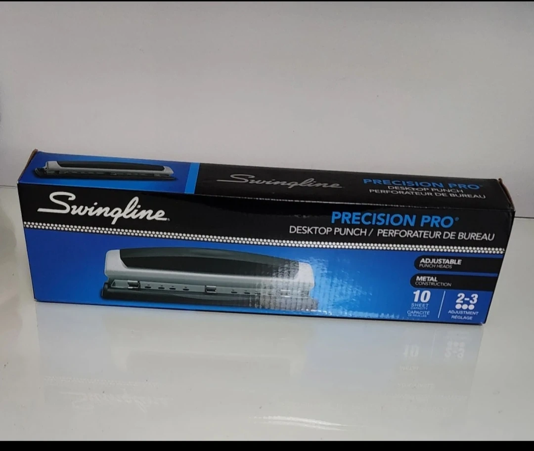 This Swingline Precision Pro desktop punch features durable metal construction. It has adjustable punch heads for 2 or 3 hole applications and can punch up to 10 sheets of paper at once. It comes with an easy-to-empty chip tray.