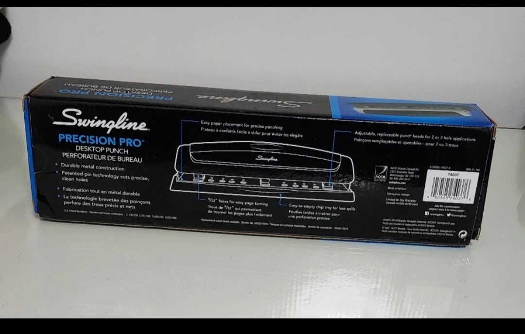 This Swingline Precision Pro desktop punch features durable metal construction. It has adjustable punch heads for 2 or 3 hole applications and can punch up to 10 sheets of paper at once. It comes with an easy-to-empty chip tray.