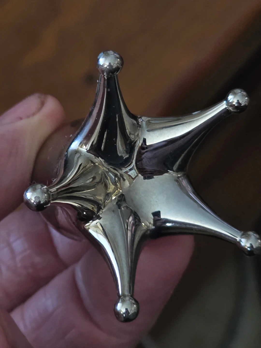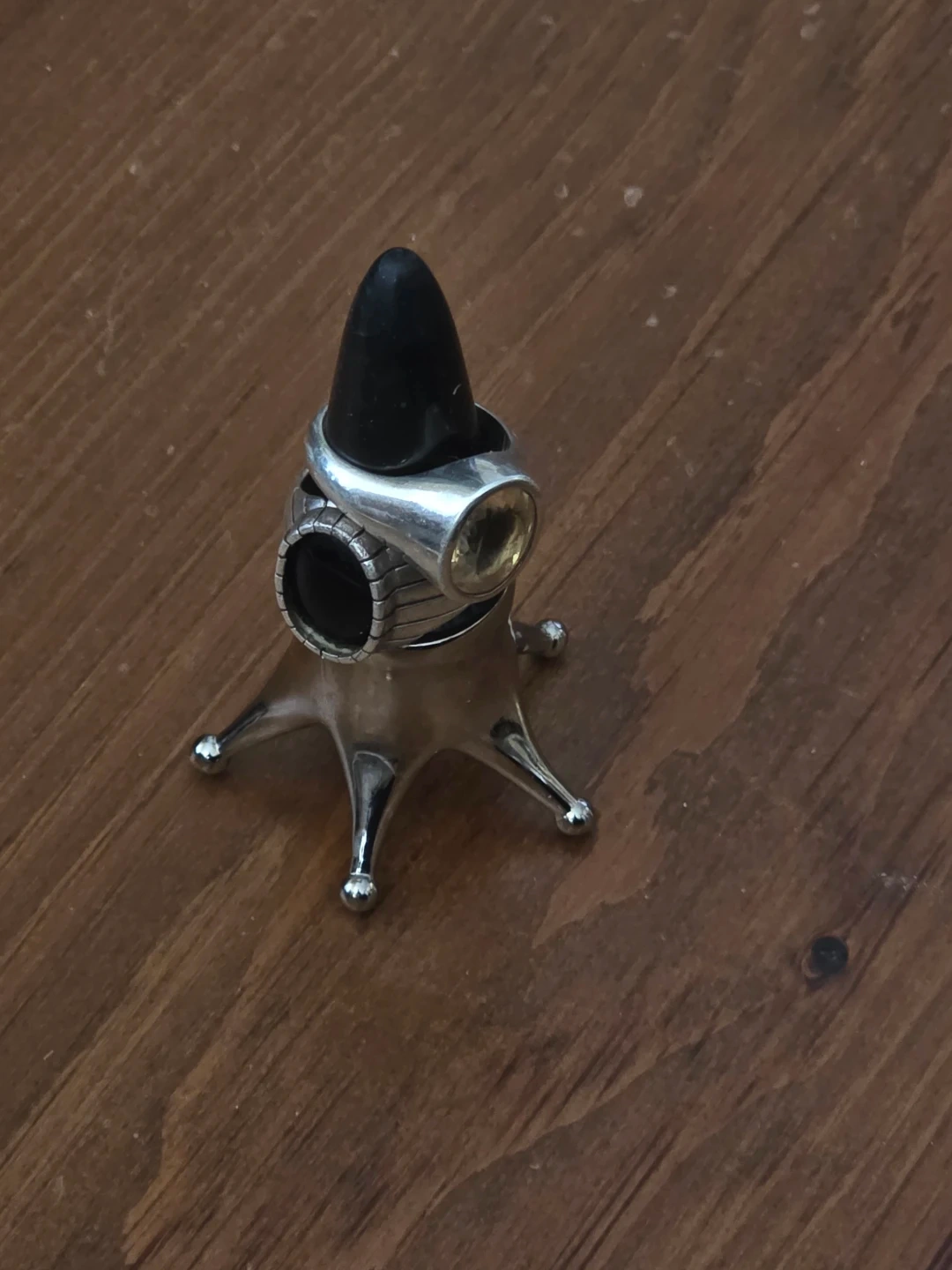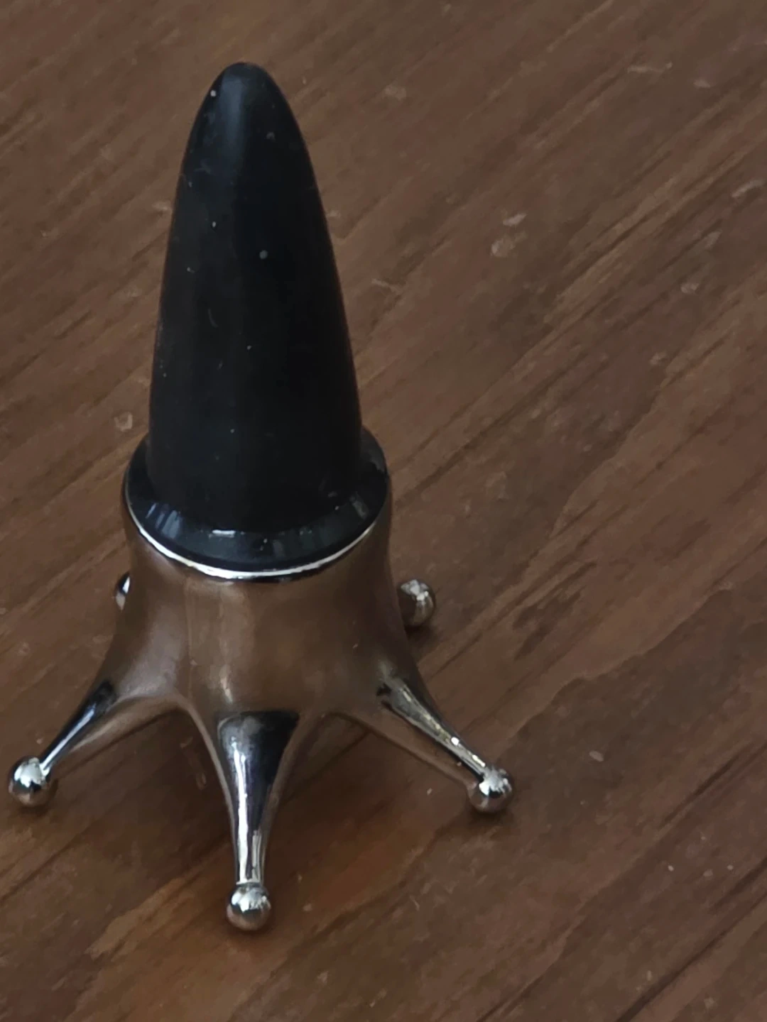 This unique star-shaped stand holds rings and other small jewellery. It's made of shiny metal with a black cone top. A neat way to organize your accessories!