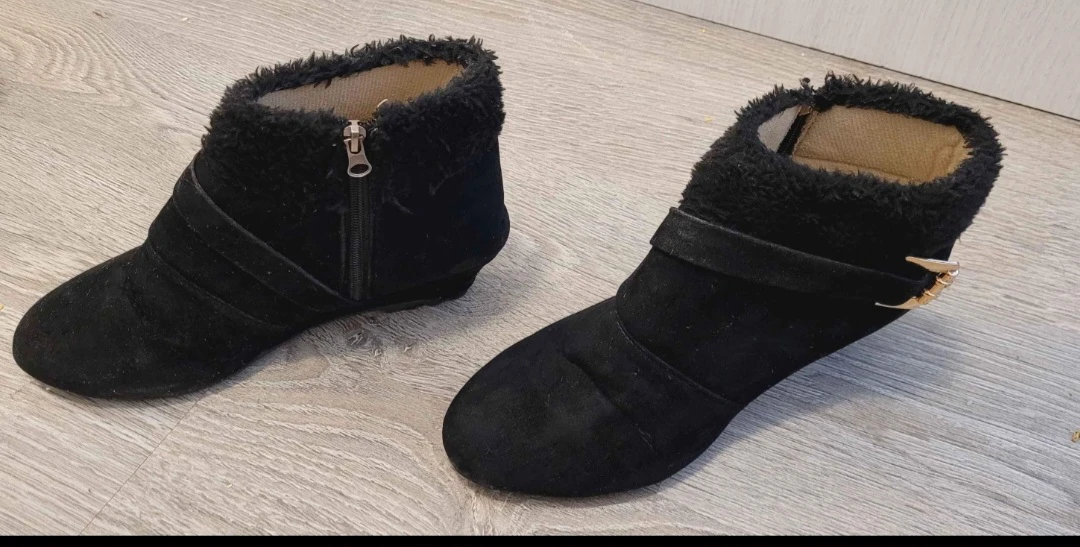 Selling a pair of black ankle boots in size US 8. They feature a faux fur trim and a stylish buckle detail. These boots are perfect for adding a touch of warmth and style to your outfit!