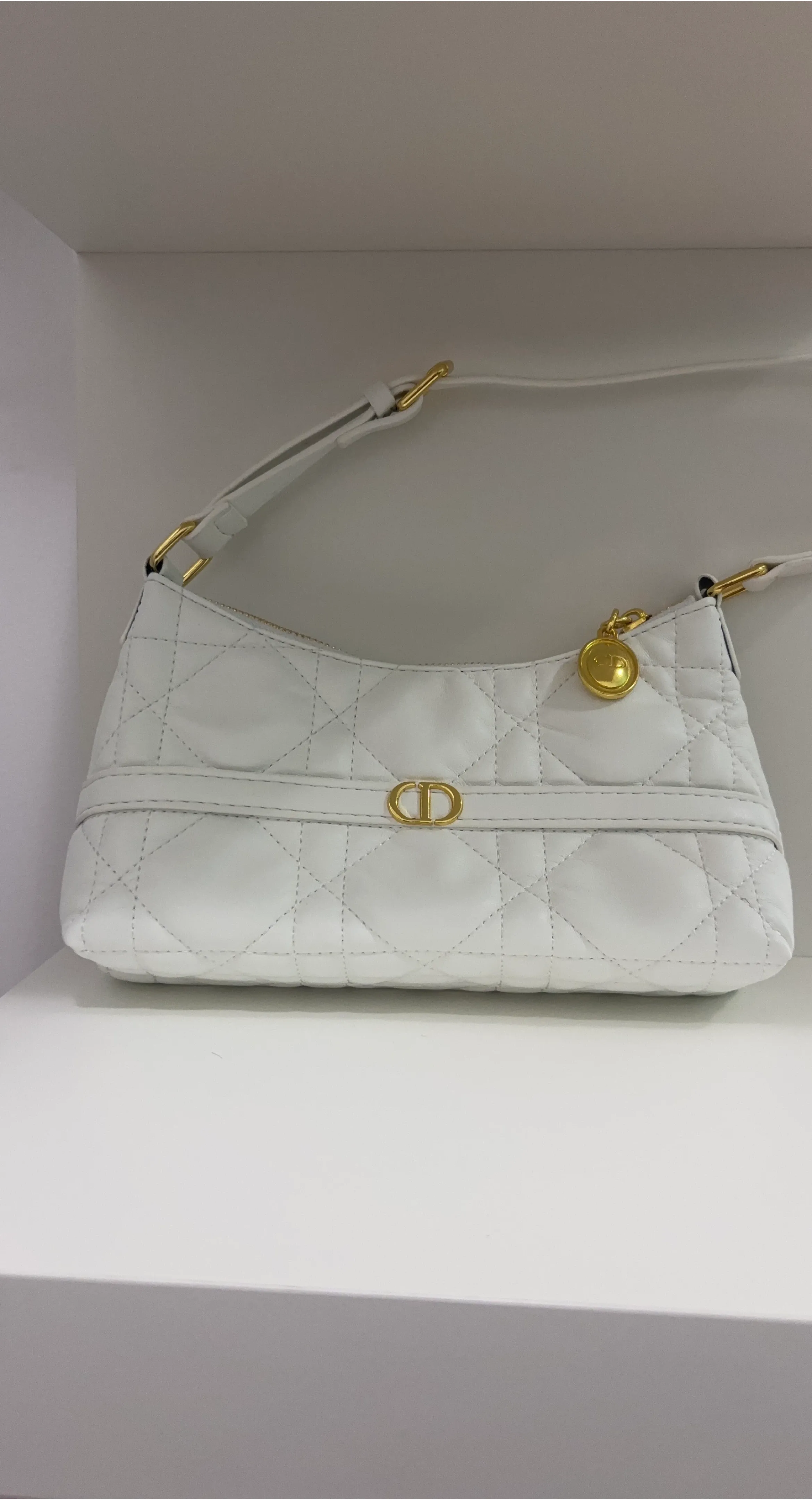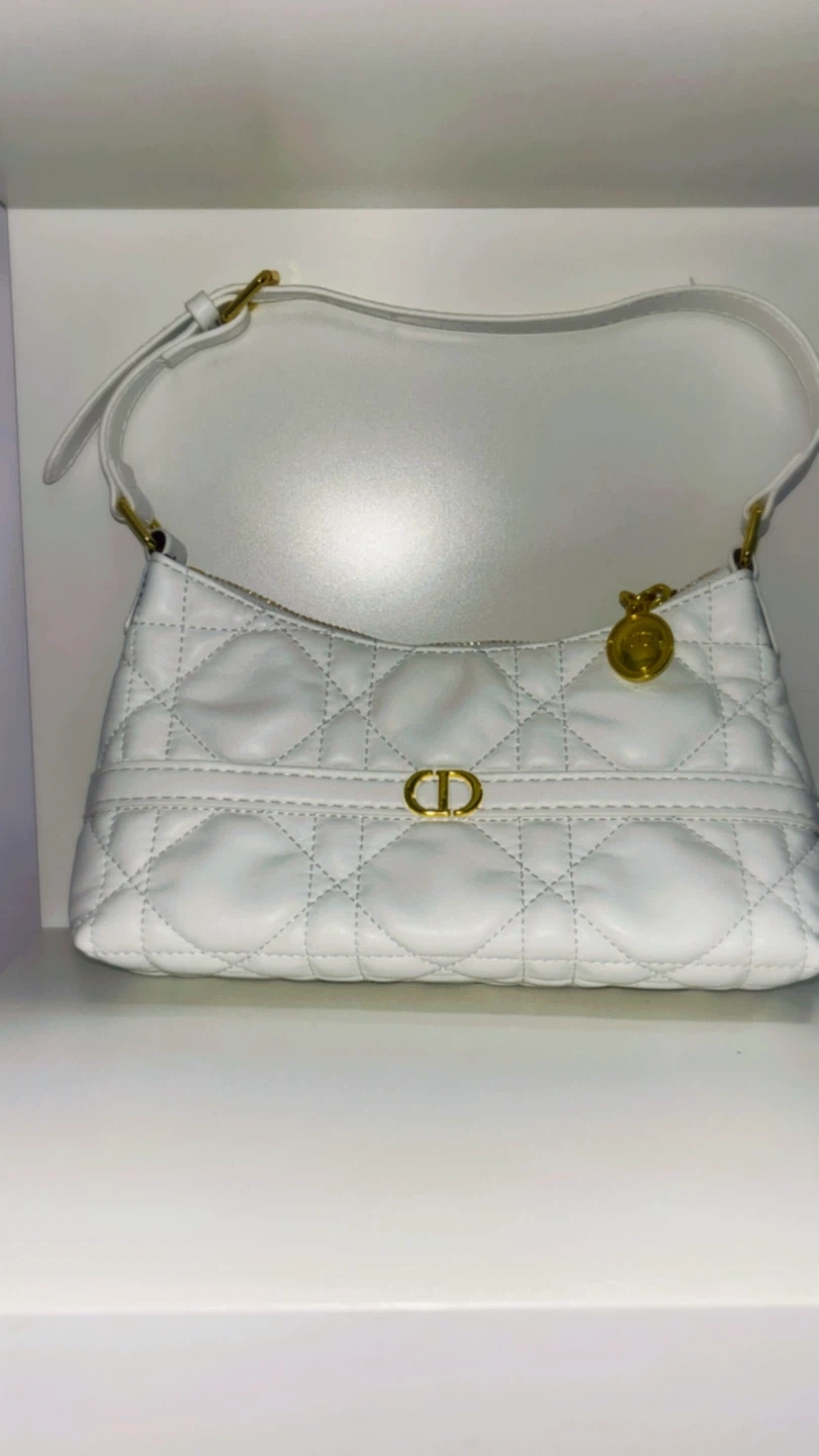 A chic white shoulder bag with gold hardware. It features the iconic cannage stitching and a CD clasp. This bag is a stylish accessory for any occasion.