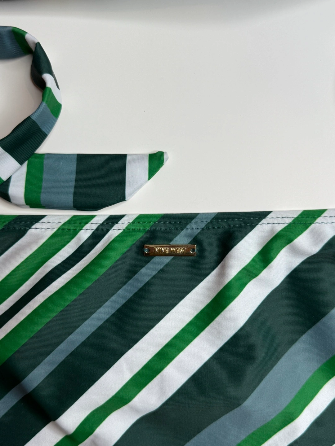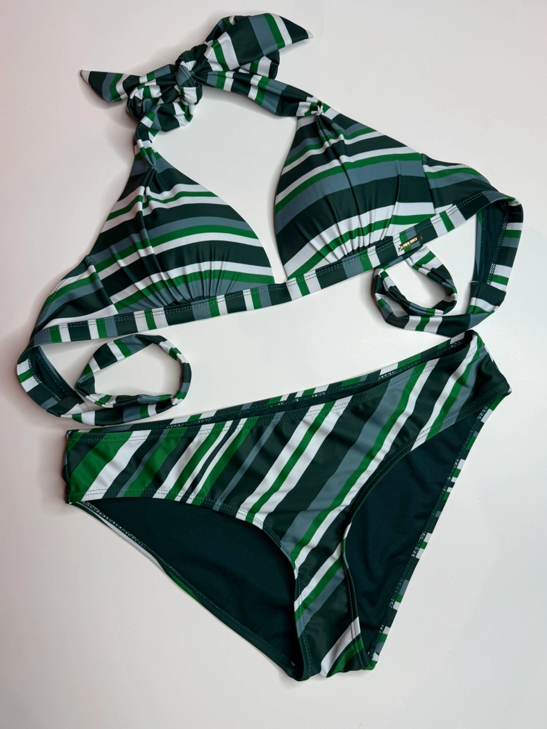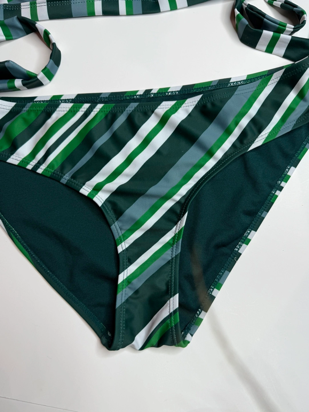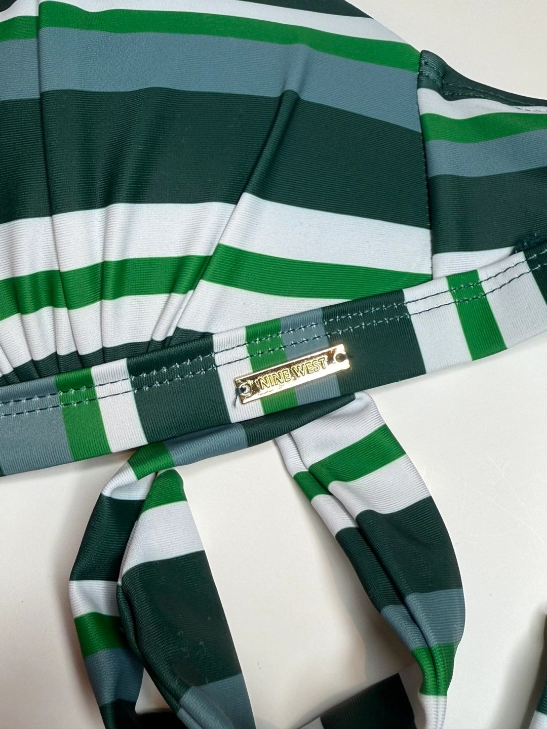 Selling a Nine West bikini set in size L/G. It features a stylish striped design in shades of green, grey, and white. Perfect condition!