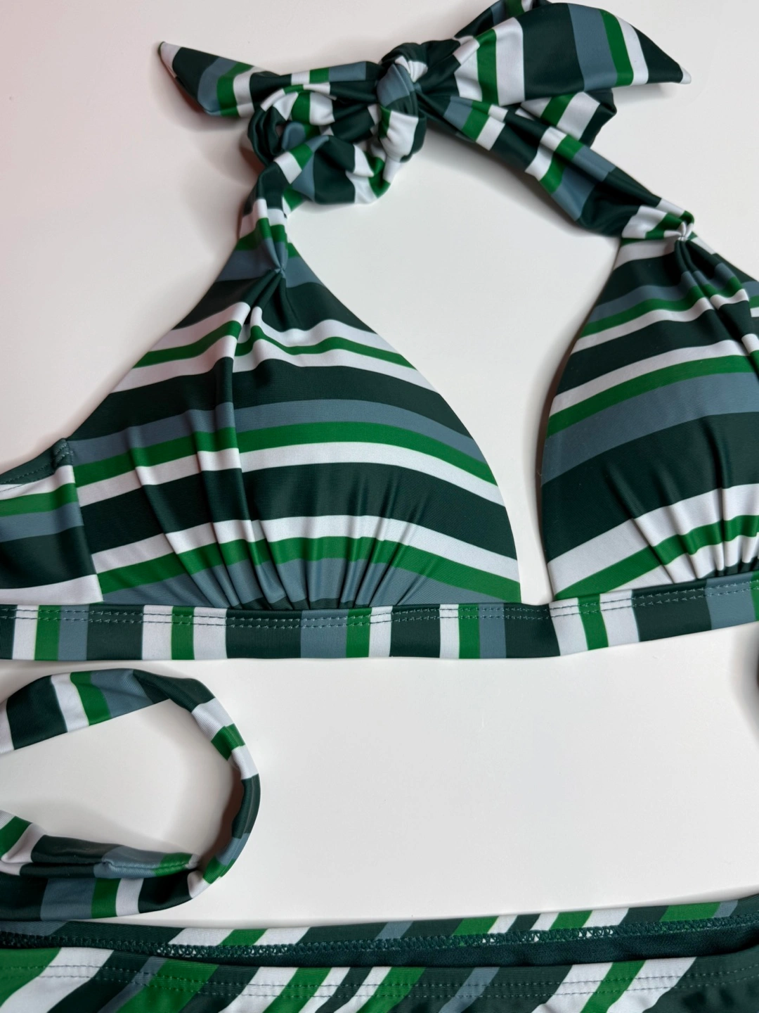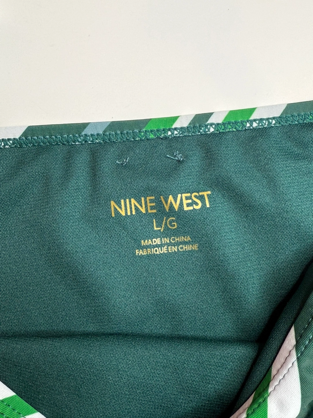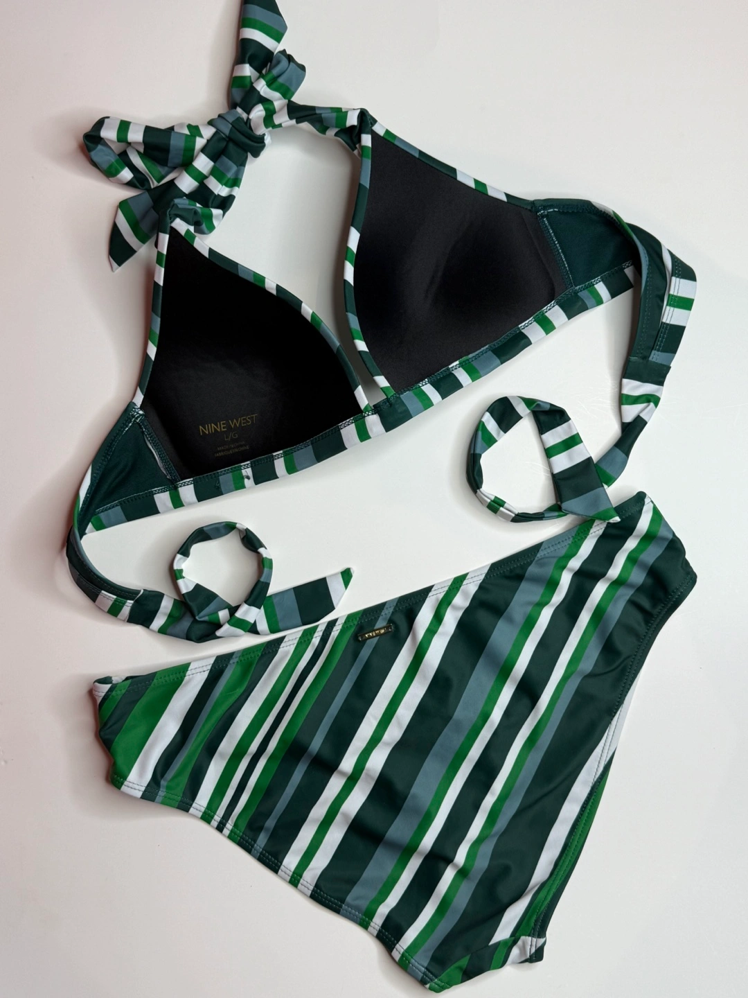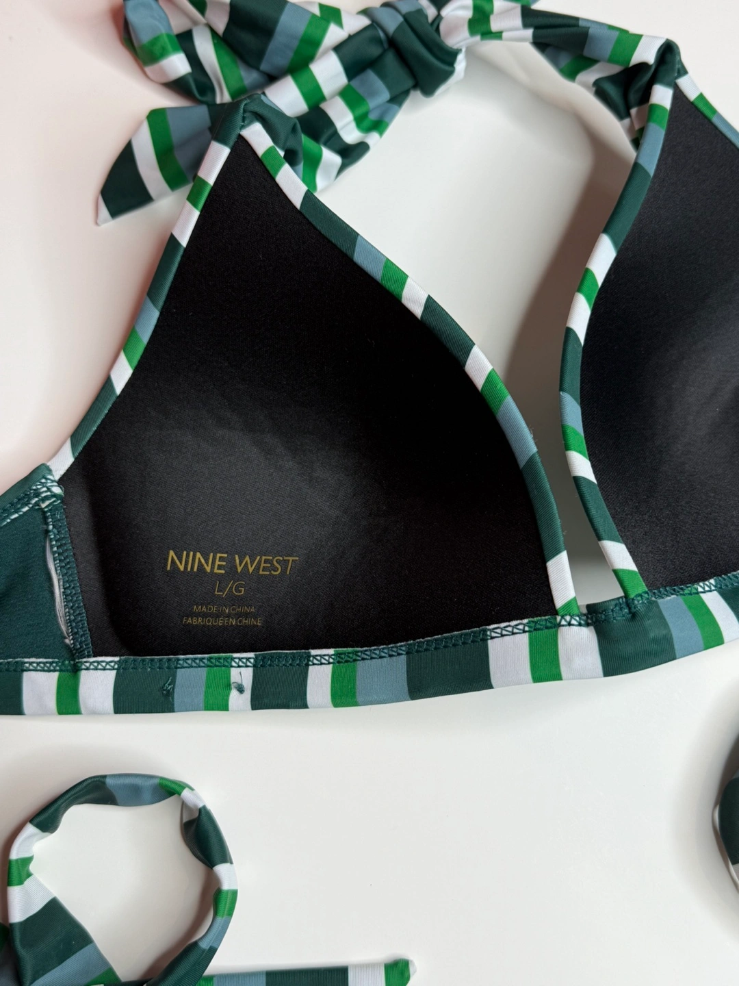 Selling a Nine West bikini set in size L/G. It features a stylish striped design in shades of green, grey, and white. Perfect condition!