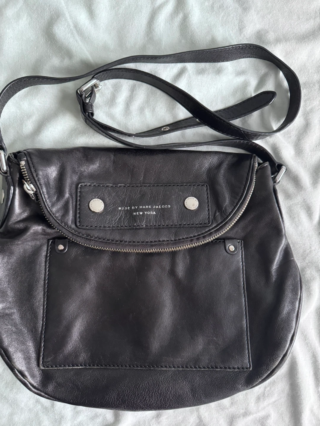 This is a black leather shoulder bag from Marc by Marc Jacobs (Authentic). It features a zippered closure and an adjustable strap. It has secret compartment perfect for everyday commute or travel. The bag's material is genuine leather.