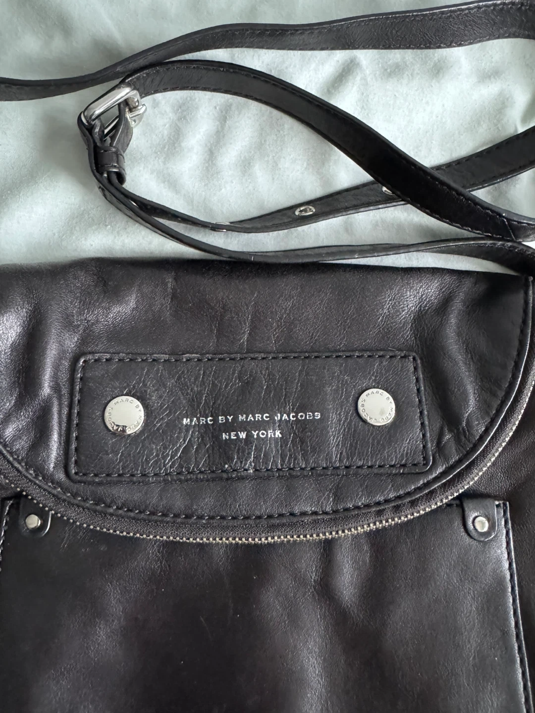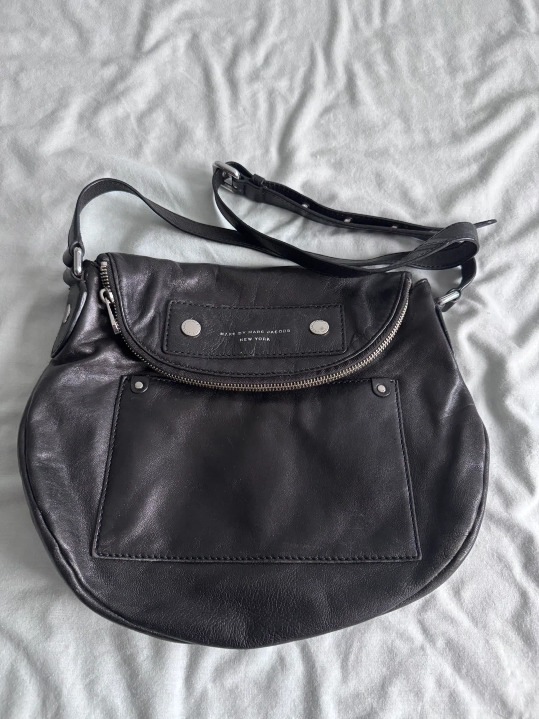 This is a black leather shoulder bag from Marc by Marc Jacobs (Authentic). It features a zippered closure and an adjustable strap. It has secret compartment perfect for everyday commute or travel. The bag's material is genuine leather.
