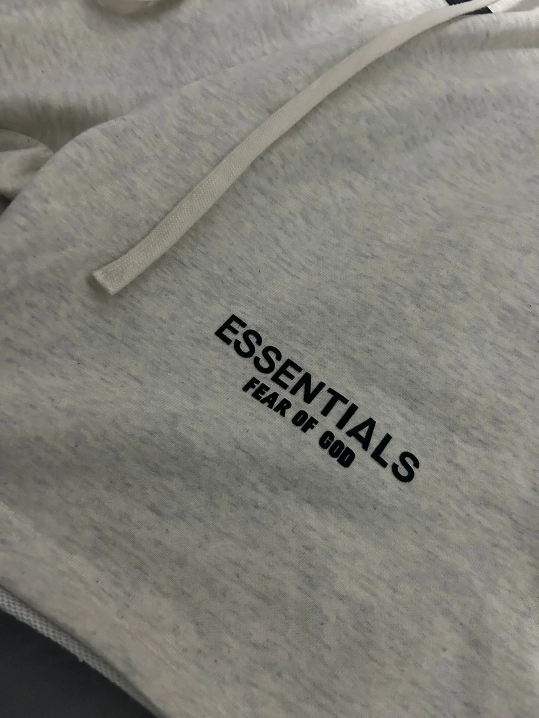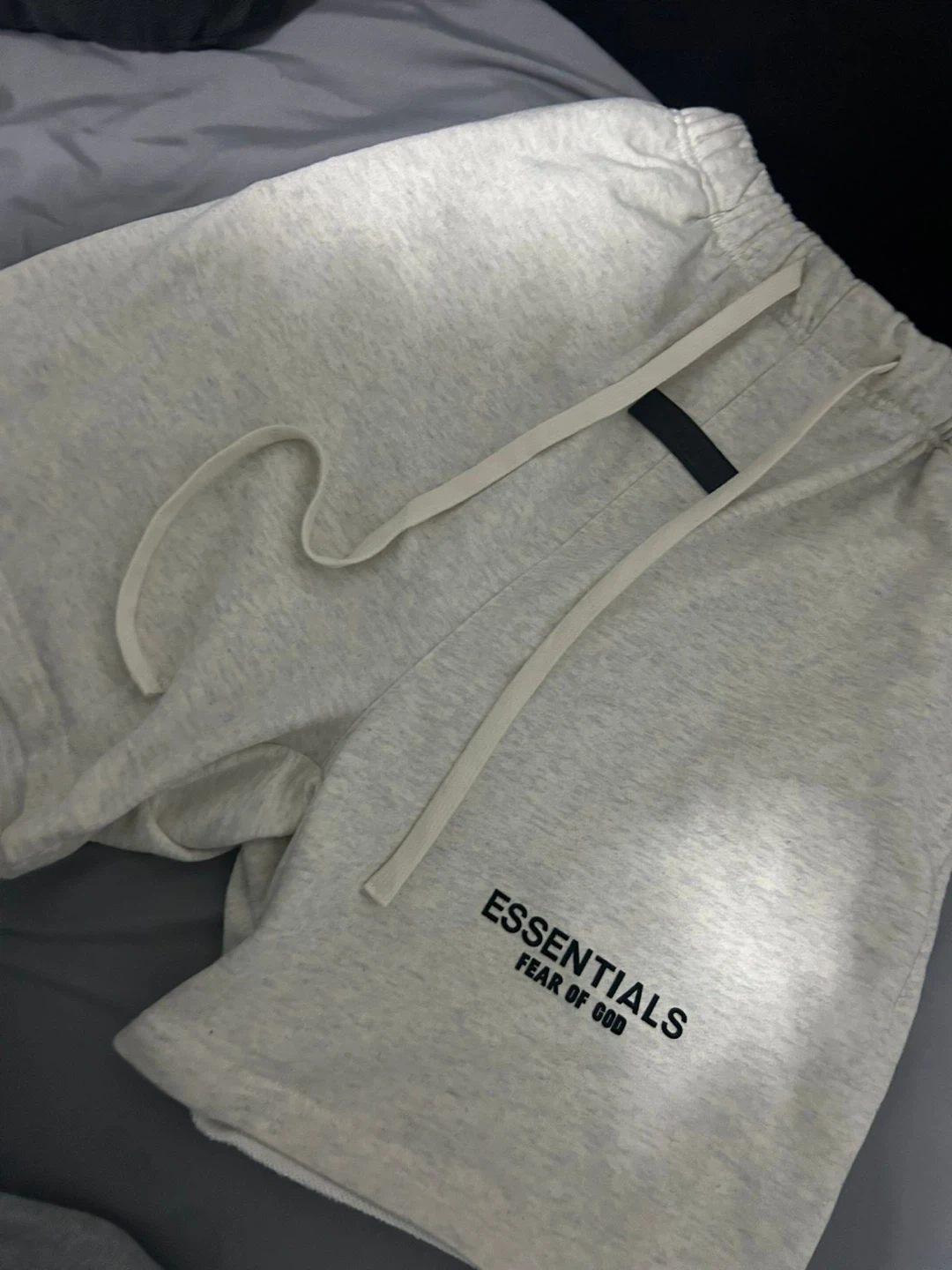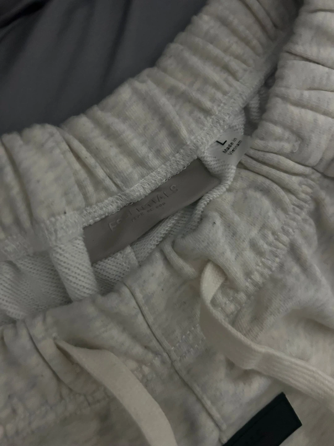 Selling a pair of Essentials Fear of God sweat shorts in size large! They're a light heather gray color and feature the Essentials logo on the front. Comfortable and stylish for everyday wear