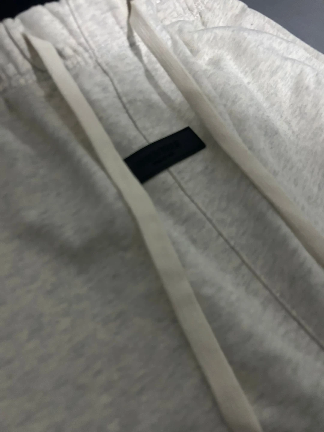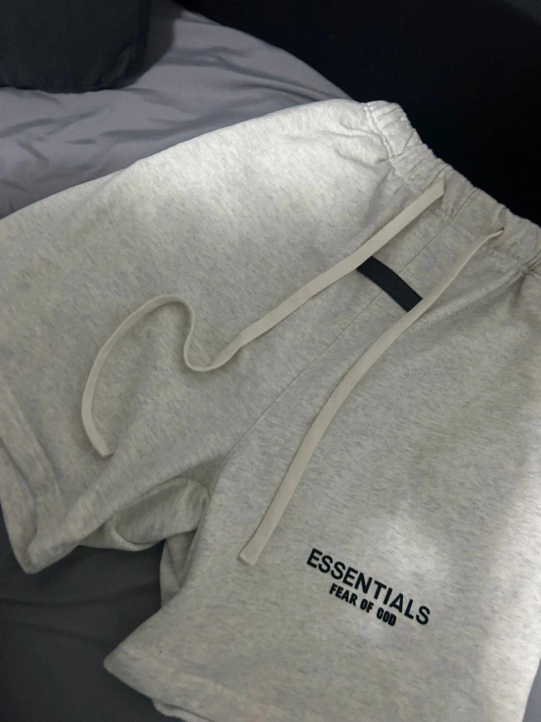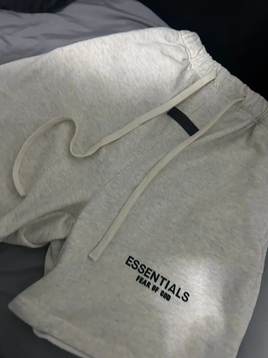 Selling a pair of Essentials Fear of God sweat shorts in size large! They're a light heather gray color and feature the Essentials logo on the front. Comfortable and stylish for everyday wear