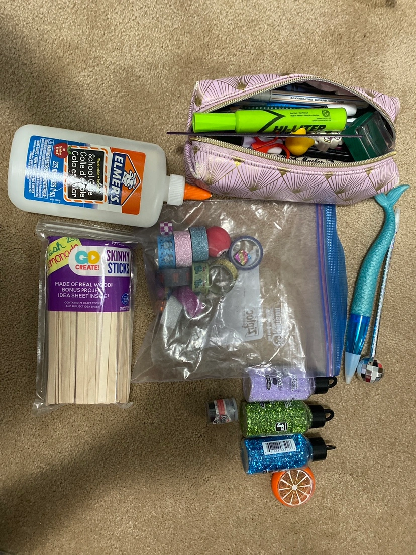 A variety of craft supplies, including glue, glitter, colourful tape, colour pencils, markers and highlighters, a ruler and more office supplies.