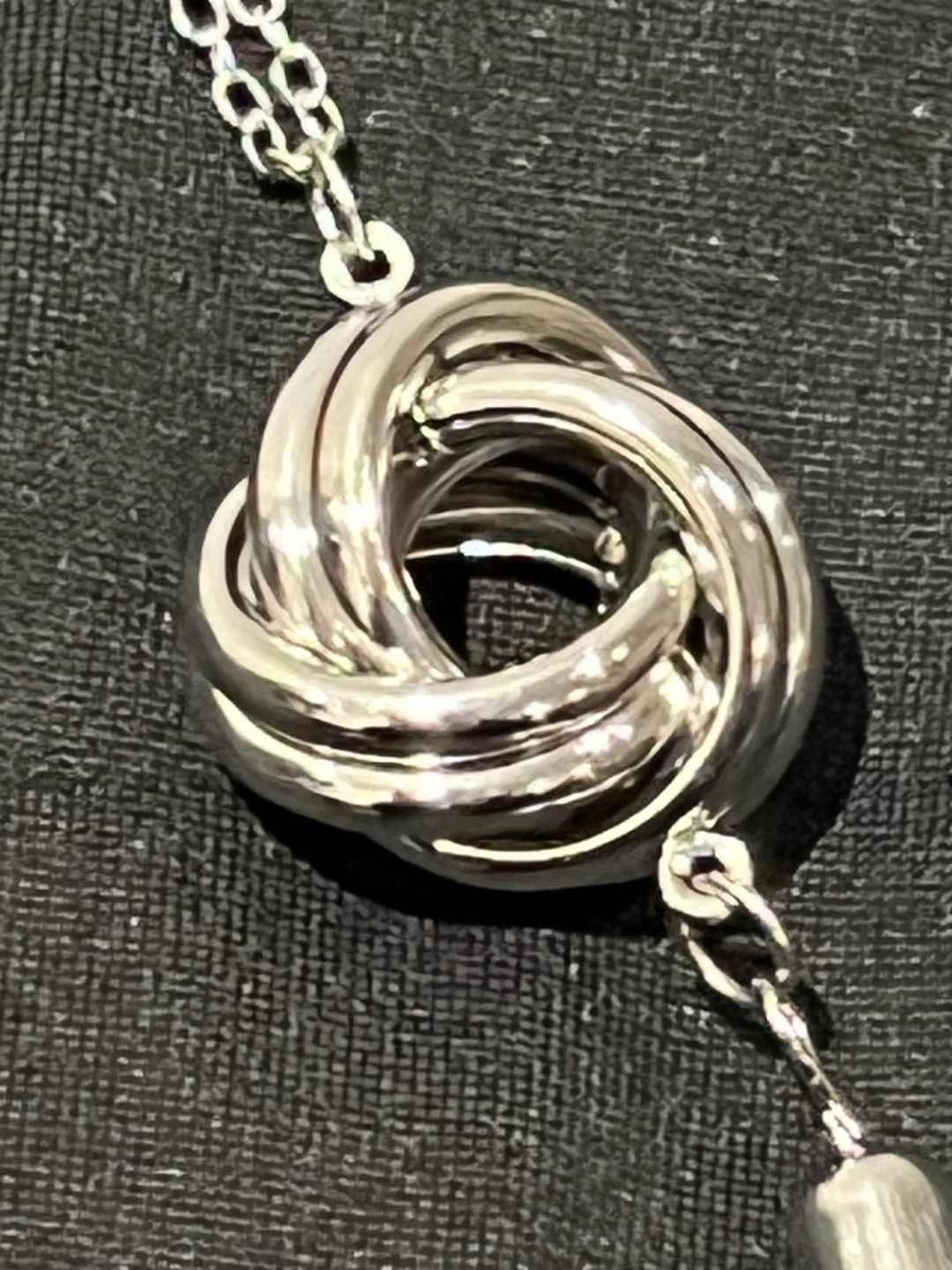 Silver tone necklace featuring a knot pendant with a delicate chain tassel. The chain has an extender for adjustable length. It's a stylish accessory for any occasion.