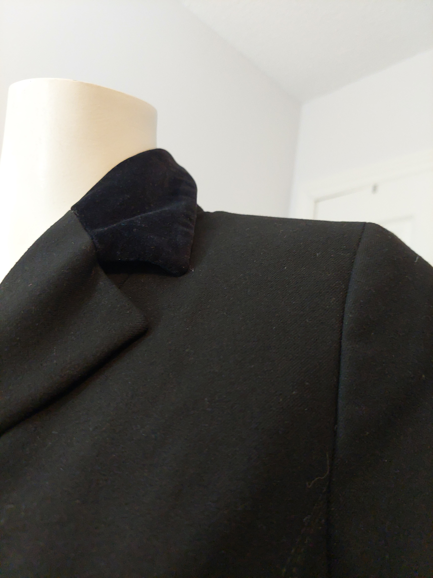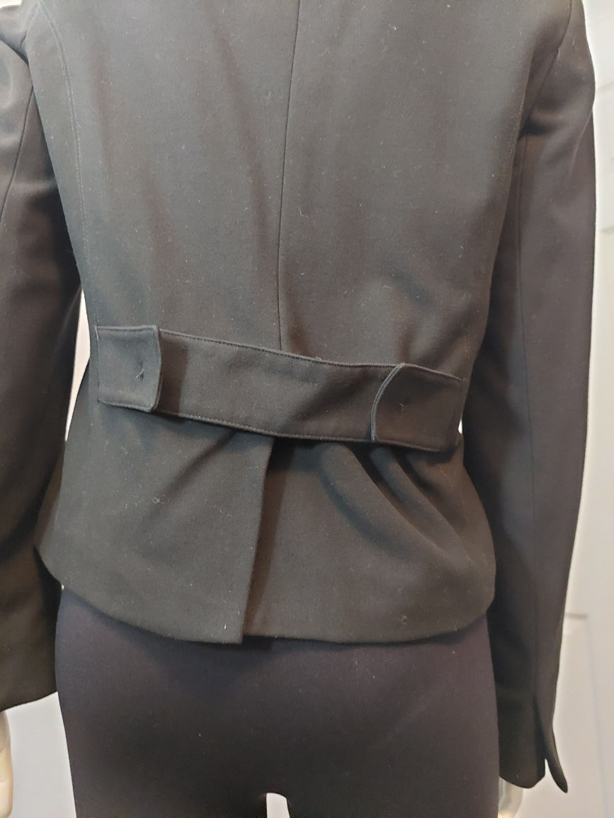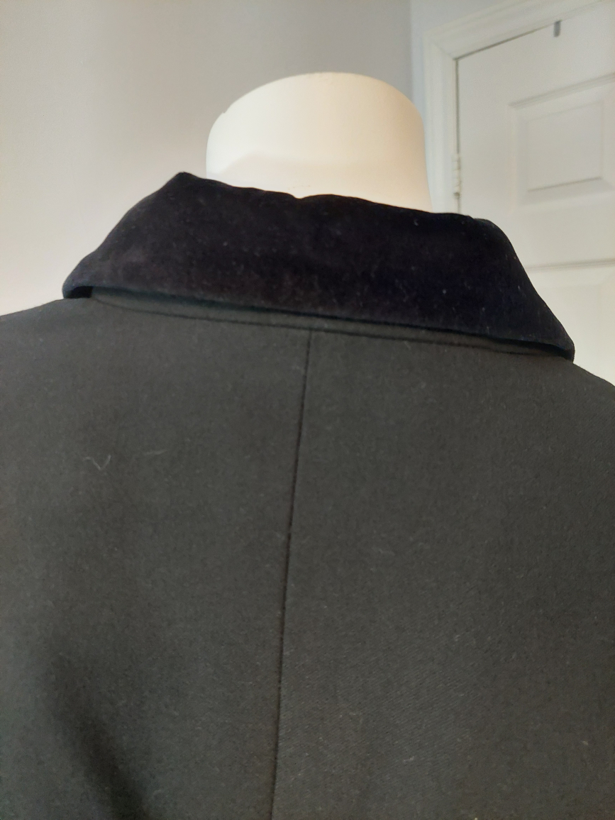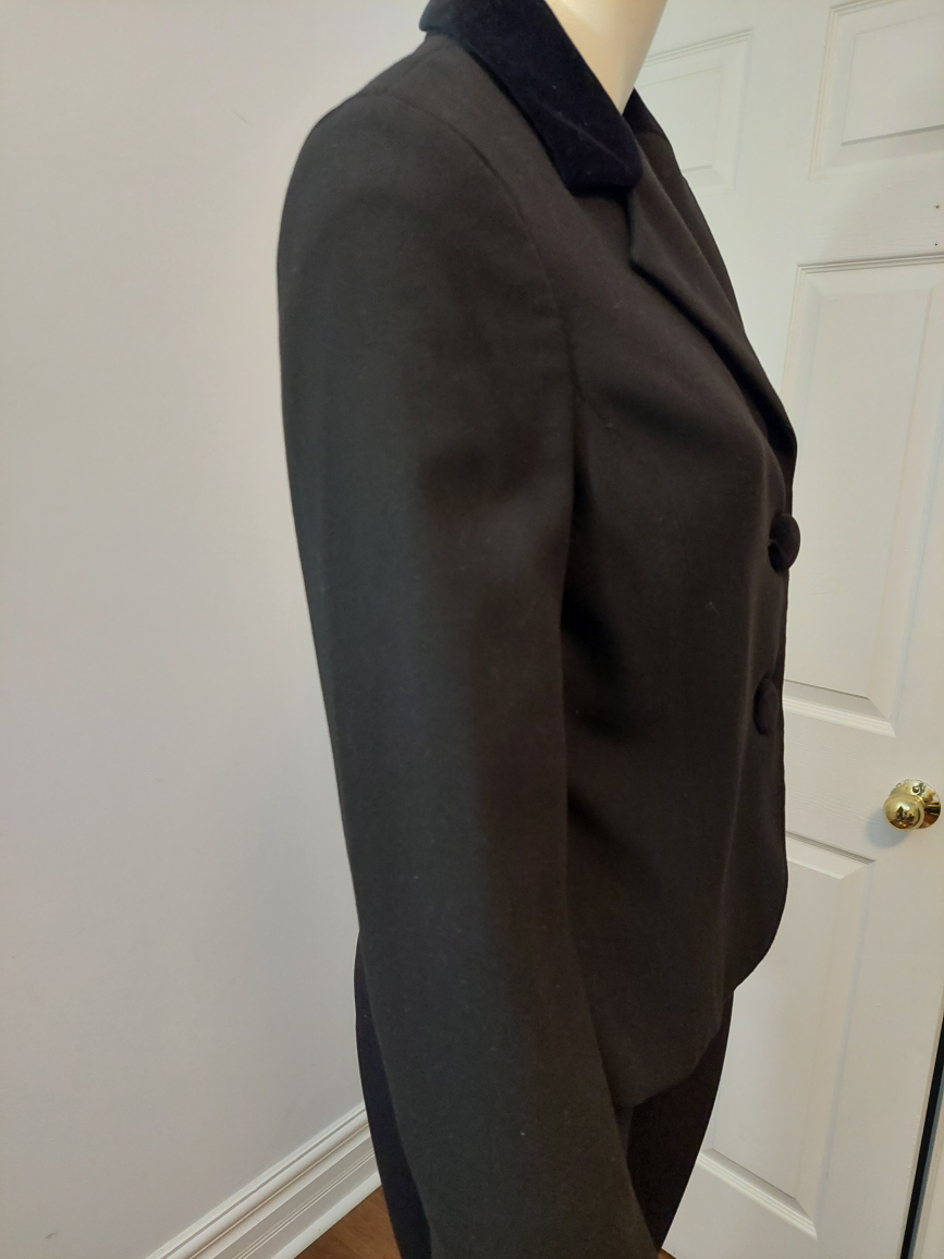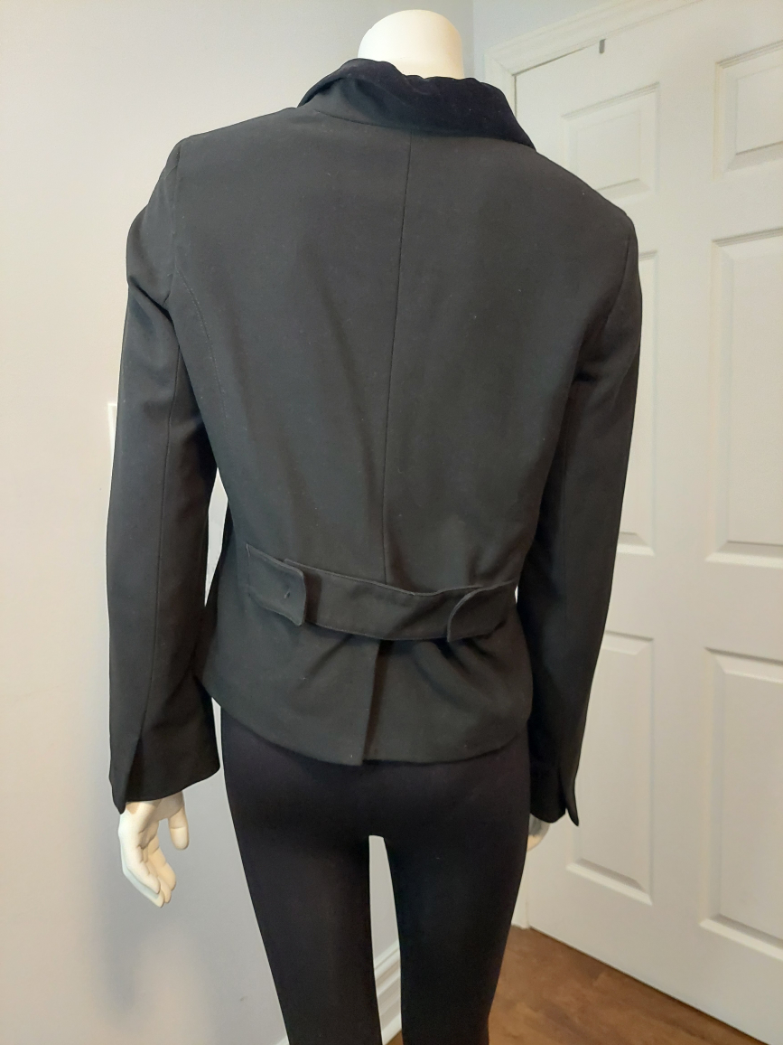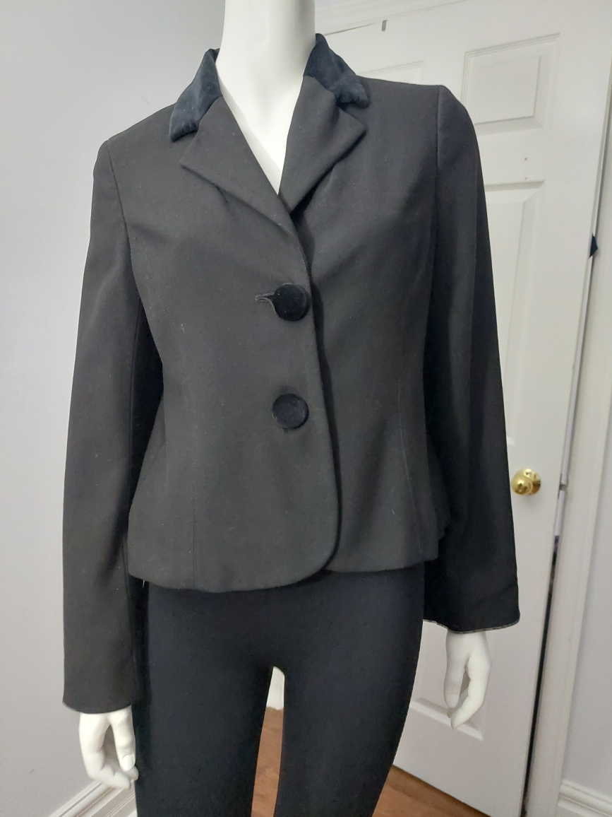 A stylish black blazer jacket, perfect for adding a touch of sophistication to any outfit. The jacket features a classic design with a velvet collar and button closure.