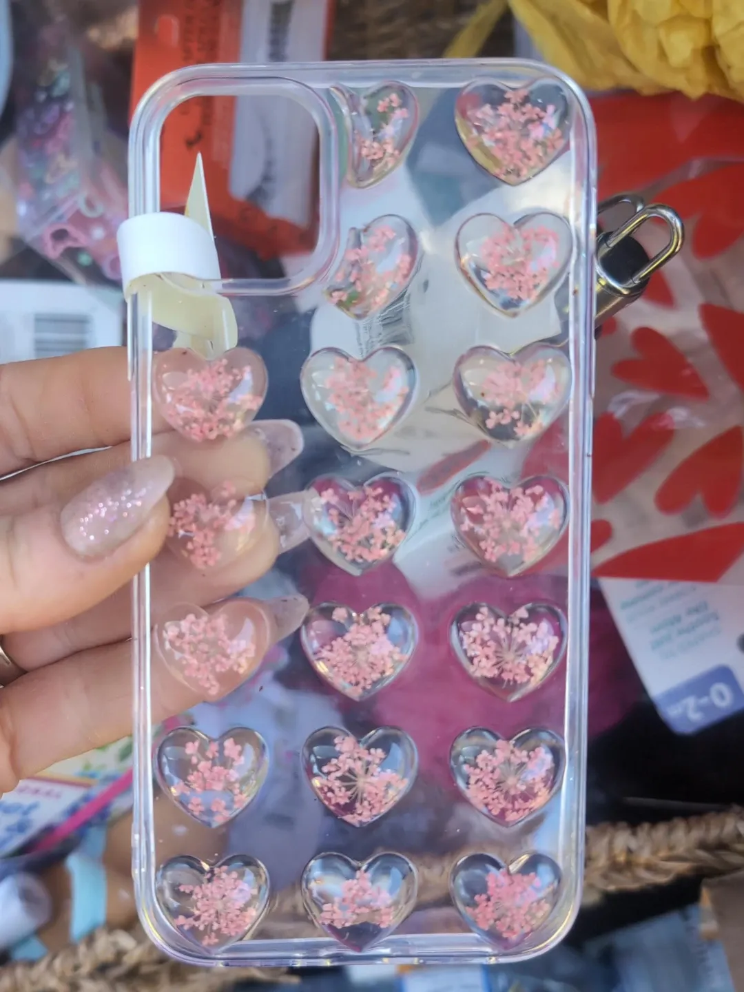 This clear phone case features a charming design with small pink flowers embedded in heart shapes. It's made of durable, clear material that protects your phone. The intricate floral detail adds a touch of elegance to your device.