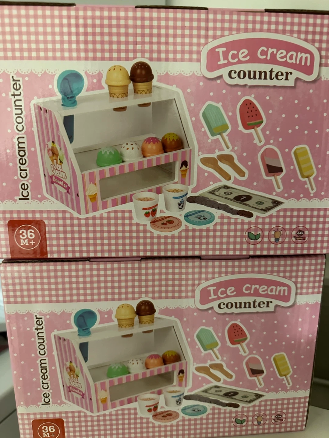 This is a fun wooden ice cream counter play set. It's designed for kids 36 months and older. It includes toy ice cream cones, popsicles, cups, spoons, and play money.