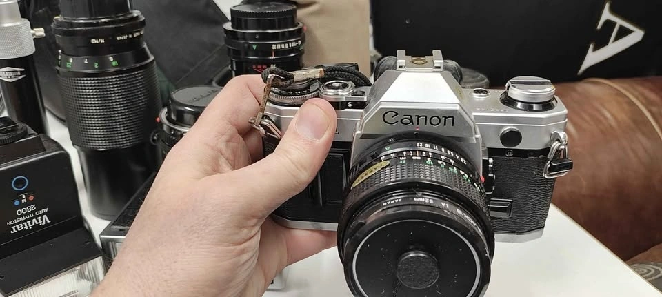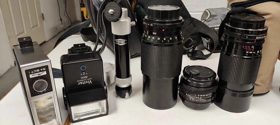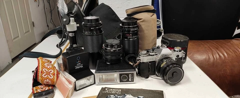Circa 1976 old school single lens reflex film camera. Comes with 4 lenses (3 Canon, 1 Vivitar), 2 flashes, multiple carrying cases, original manuals, and a mini tripod. Feel free to message if you have any questions!