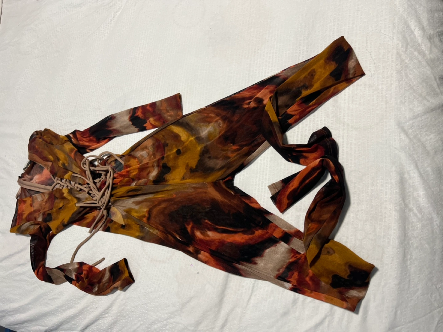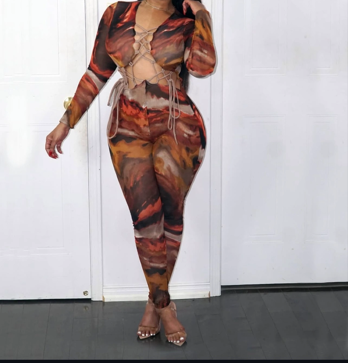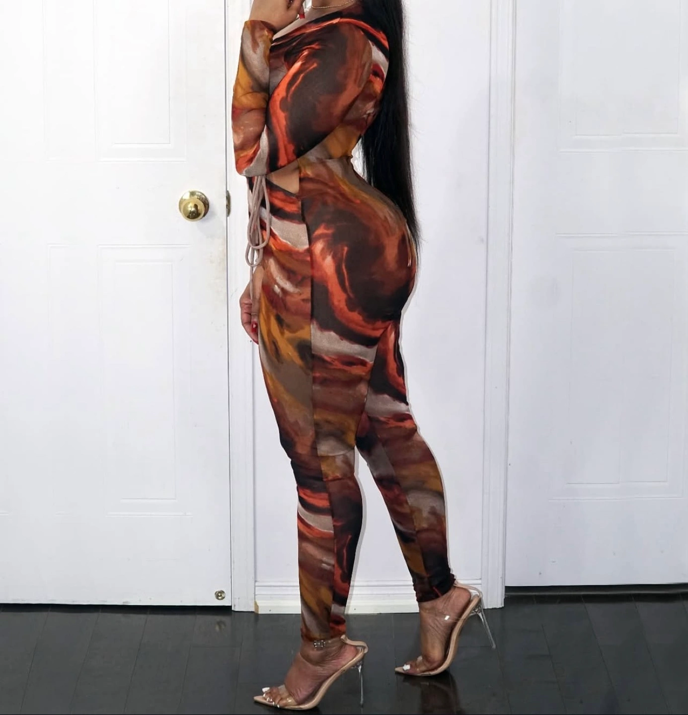 Long-sleeve sheer jumpsuit. Features a lace-up detail at the bodice. Brown, orange and beige abstract print. Great for a night out.