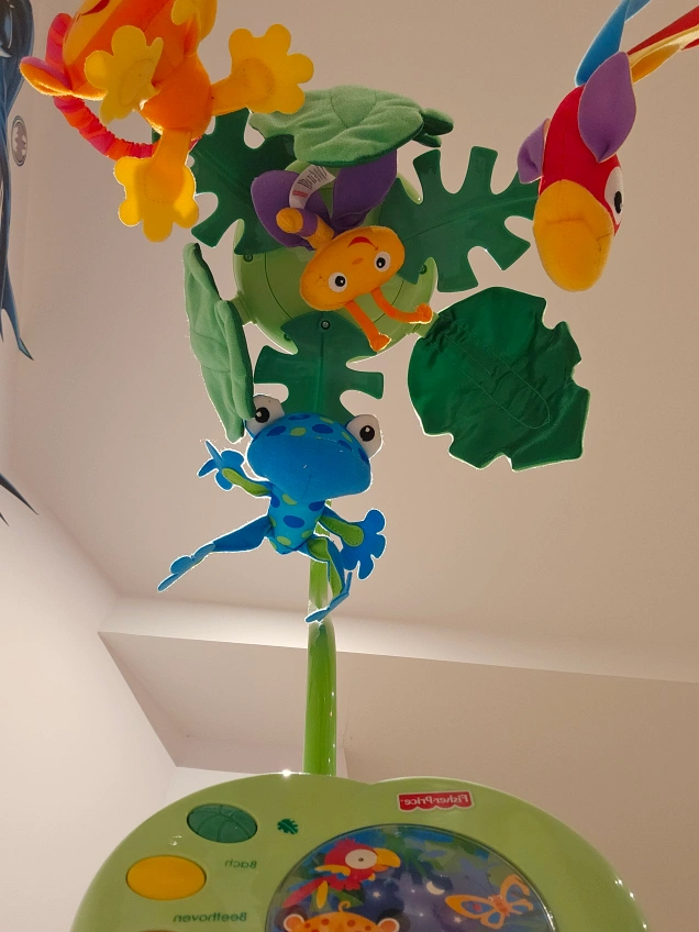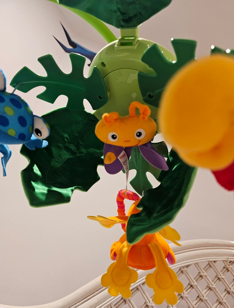 A baby crib mobile with musical capabilities, and multiple hanging toys. It is decorated with jungle themed characters. Batteries needs to be replaced