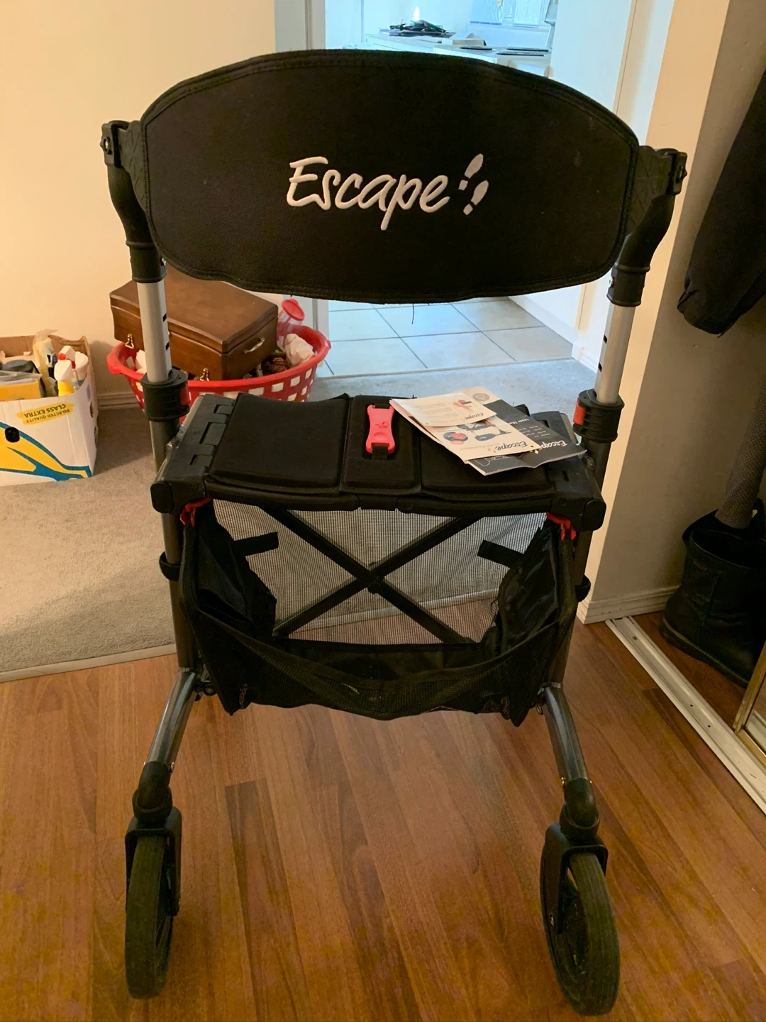 This is an Escape brand rollator walker. It's black and grey with adjustable handles. It features a seat and a storage bag underneath. It's lightweight and folds for easier transport.