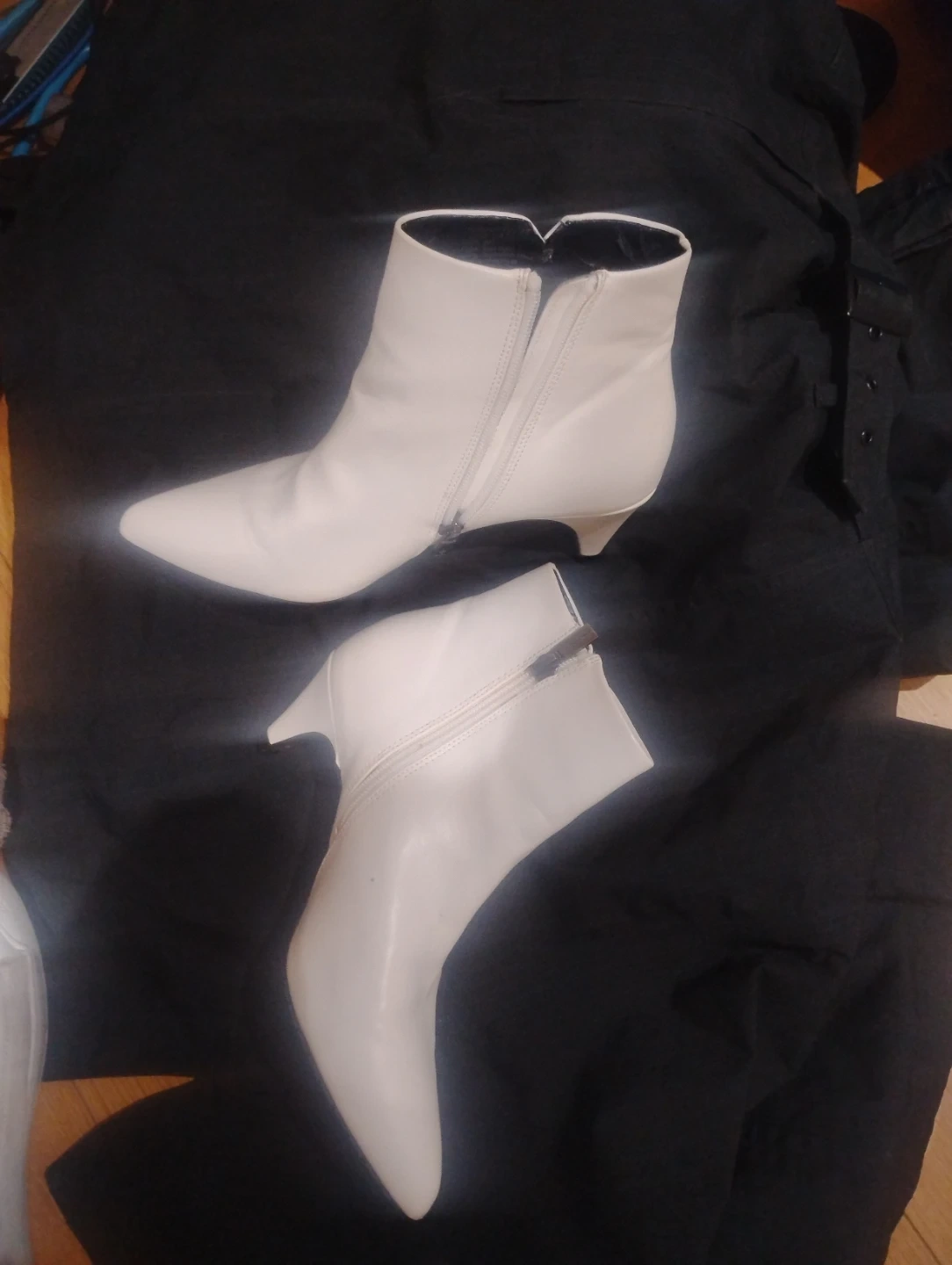 These are white heeled ankle boots from Reaction Kenneth Cole. They have a pointed toe and side zippers. The lining is textile and the outsole is man-made. These boots would be great for dressing up an outfit!