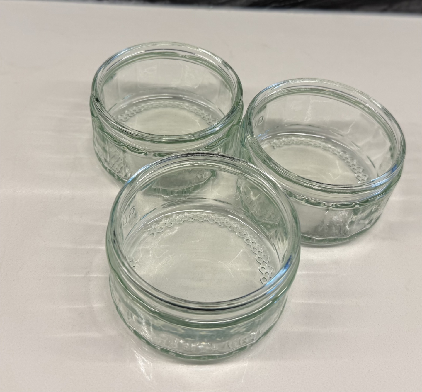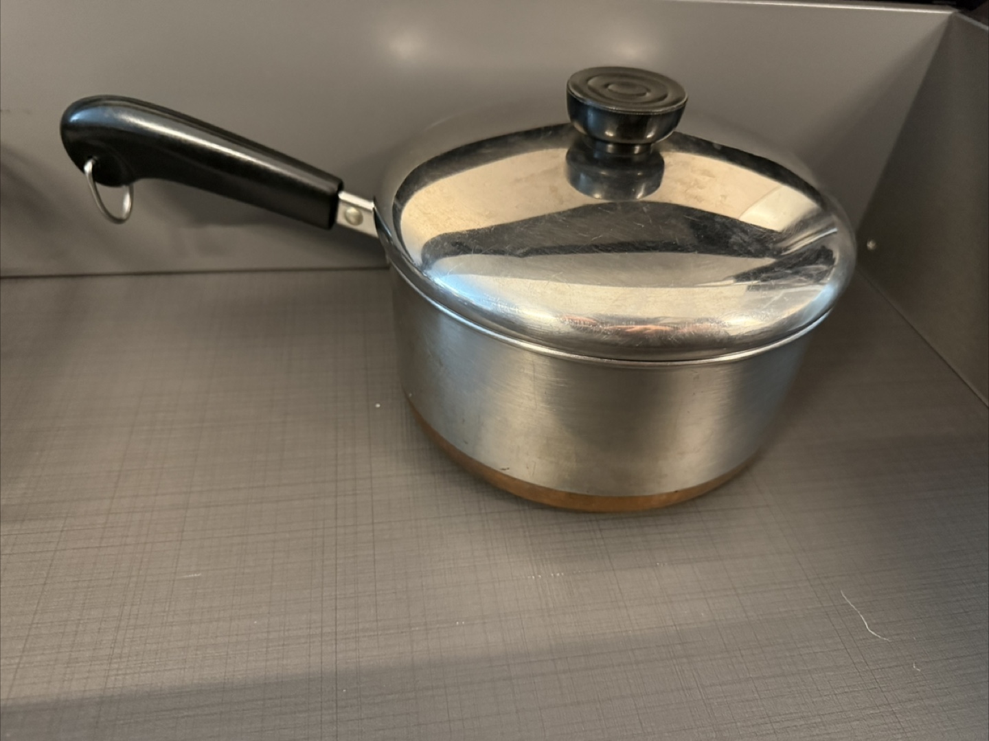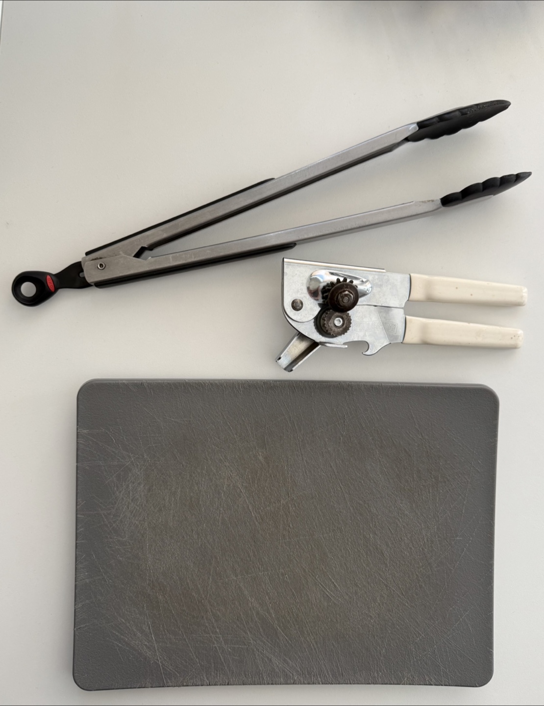 A collection of various kitchen items ready for a new home! Includes short glass container, four microwave and dishwasher safe red bowls, a cutting board, tongs, a can opener, and a saucepan
