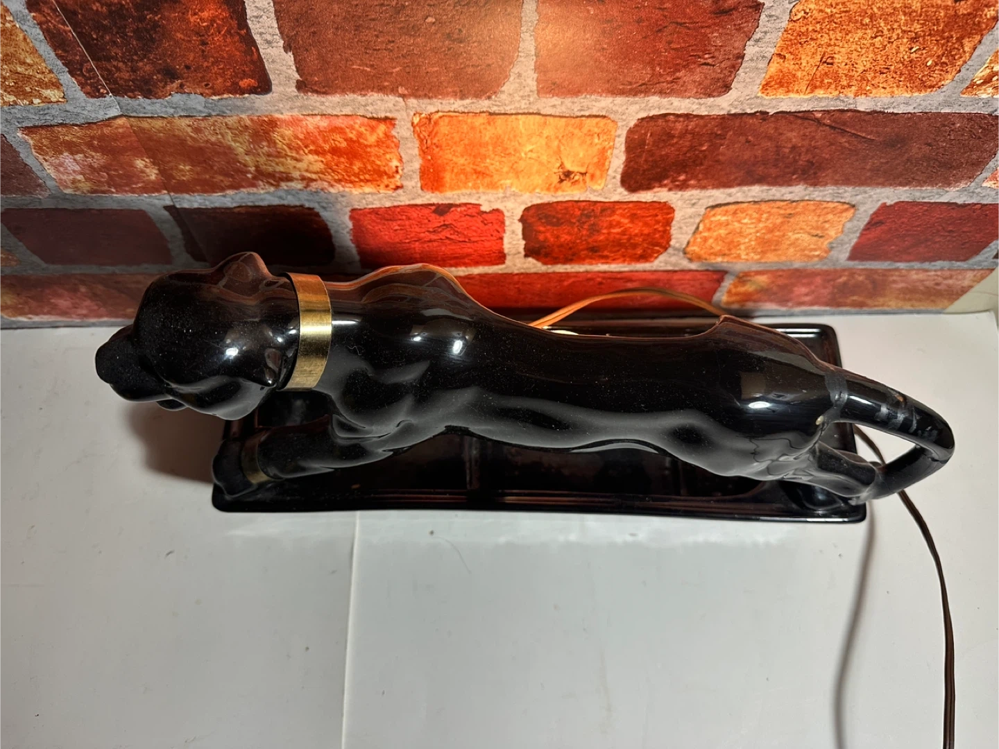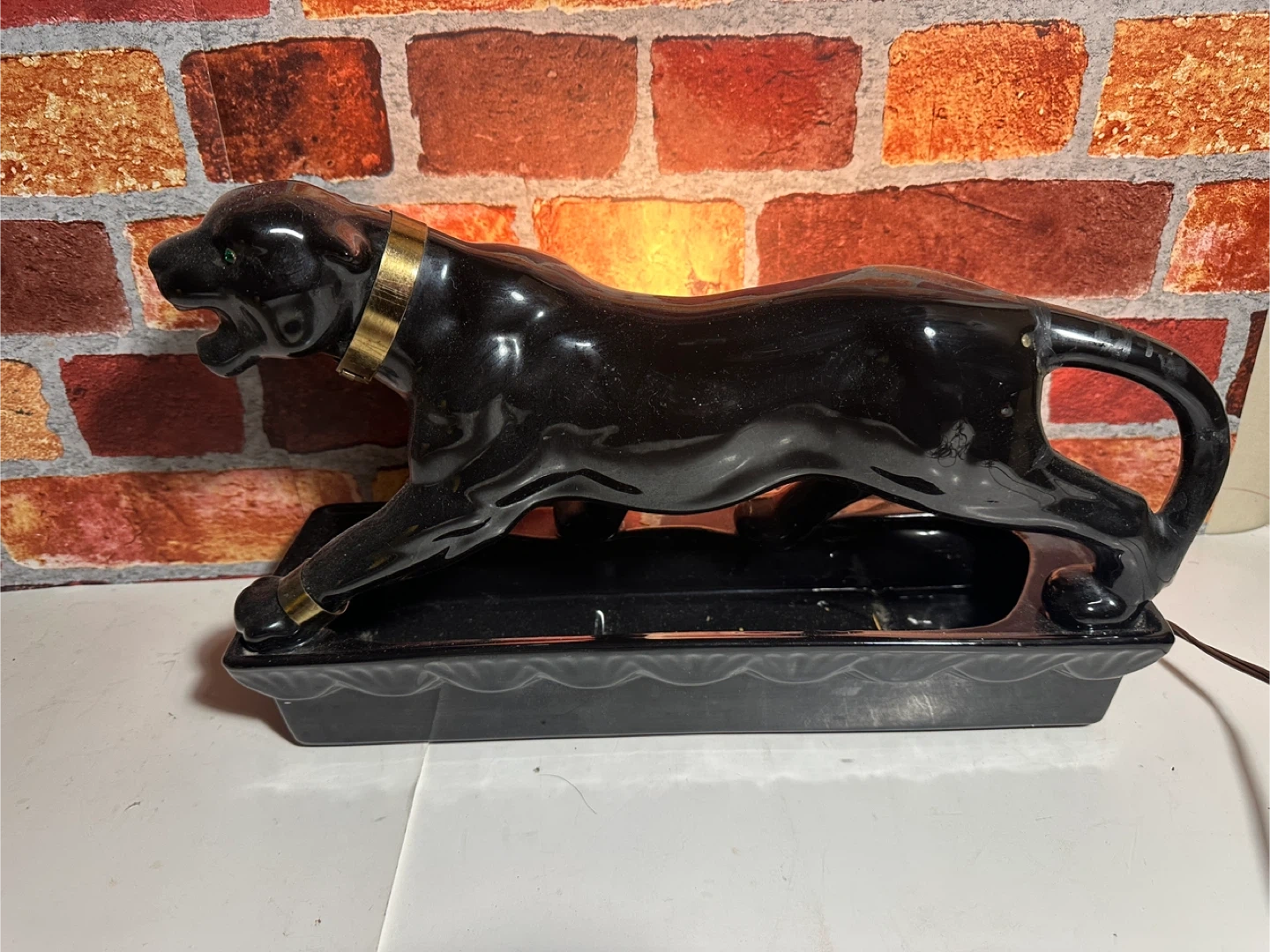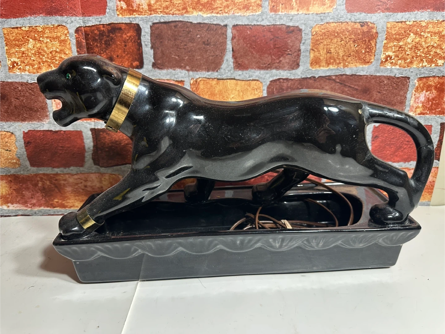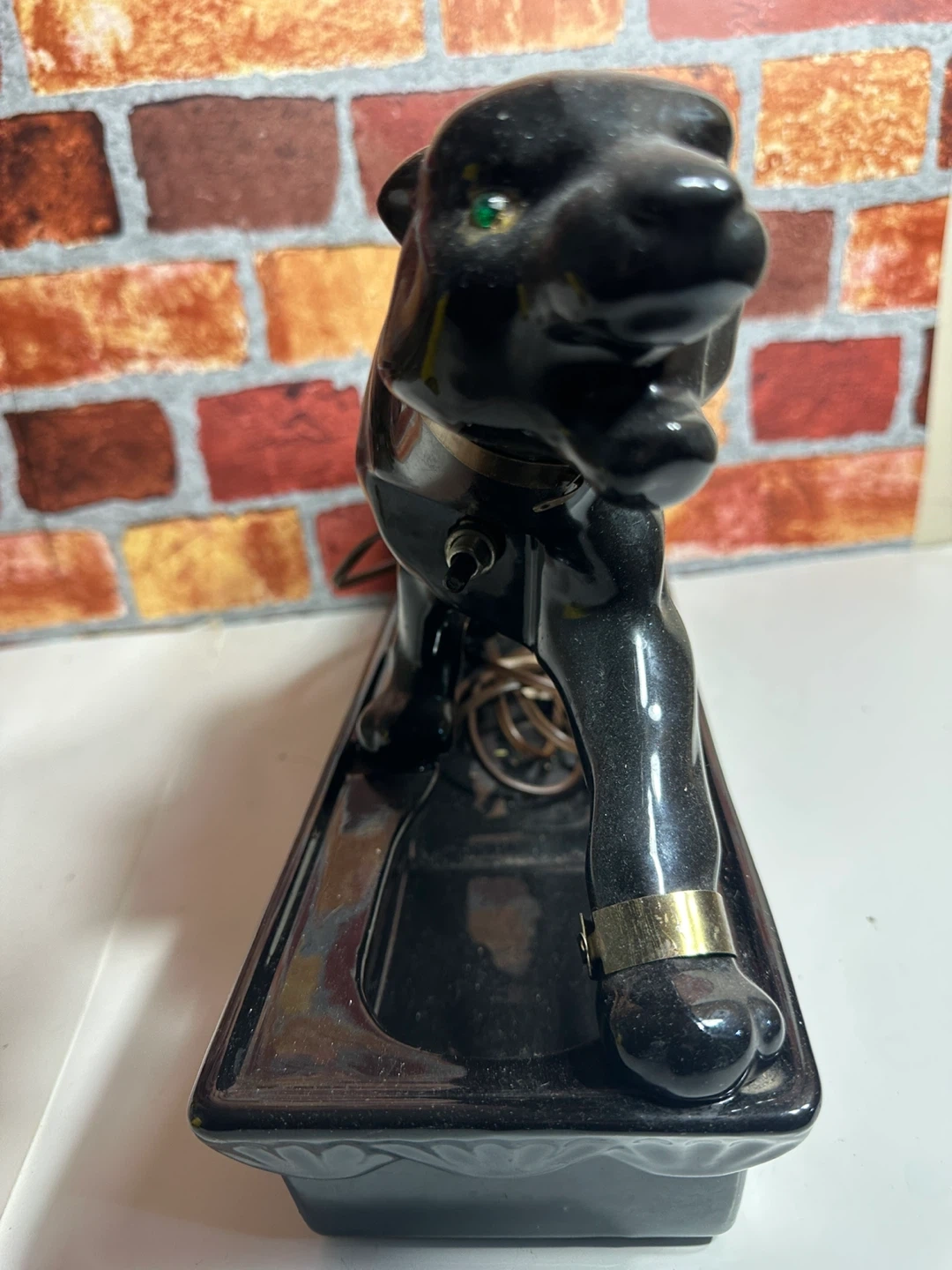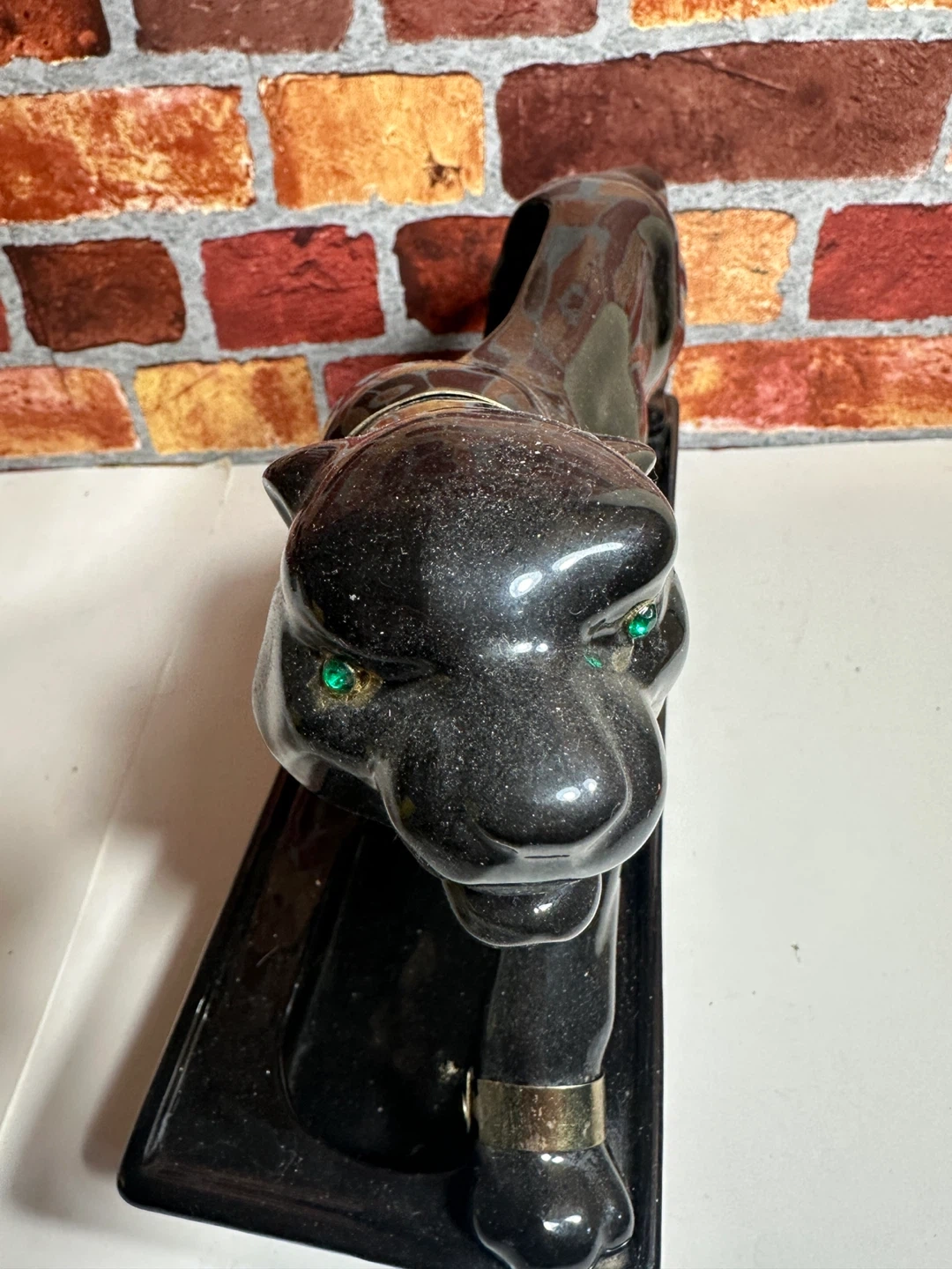 This black ceramic panther lamp features striking green gemstone eyes and a gold collar accent. It's a unique statement piece that adds a touch of retro flair to any room. The lamp includes a light bulb and cord. there has been some repair, but it’s still a cool piece.